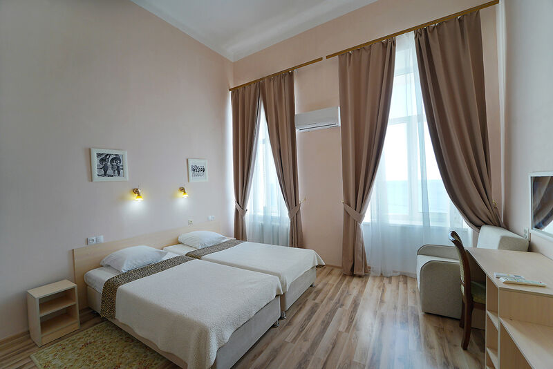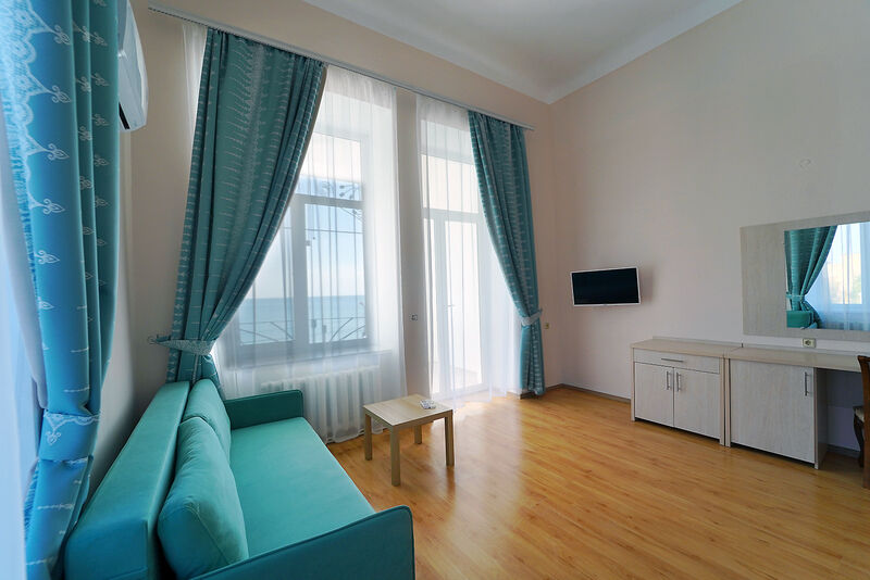 Просторный двухместный номер с видом на море, без балкона. Светлая комната с большими окнами и высокими потолками создает атмосферу уюта и комфорта.