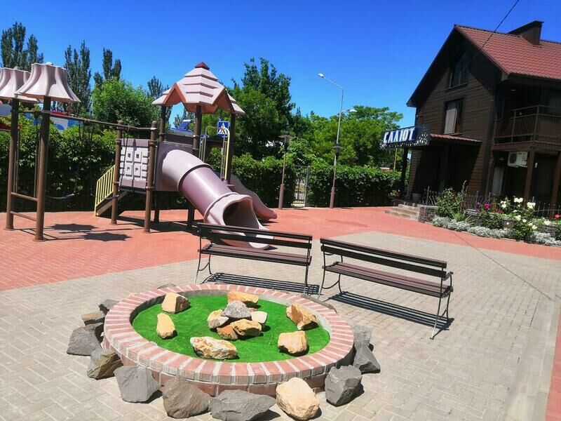 июнь 2017 г.Красиво и со вкусом!База отдыха понравилась, пляж достаточно чистый, песок мелкий, море тоже мелкое. Красивая территория, с беседками, скамеечками и горкой для детей. Есть мангал, автостоянка и Wi-Fi . Обслуживание нам тоже понравилось - никто не разу не нахомил, вежливые и быстро реагирующие на любые просьбы сотрудники. Мебель в номерах приличная, постельное и полотенца новые и видно что поглажены. Кондиционер, TV, чайник, холодильник - все работает. Номер убирали и меняли полотенца и постель на 4й день. Если не придираться к мелочам, то можно здорово отдохнуть. Территория охраняется, ходит дядечка охранник, мусор тоже с территории оперативно убирают. Ни разу за 9 дней не было слышно никаких признаком "разгульного" отдыха. Для отдыха с детьми самое то, что надо. Спокойно можно ночью спать с открытым окном, а не слушать музыку с дискотеки под окнами. Погуляв по Ейской косе, мы поняли, что САЛЮТ - одно из лучших мест.