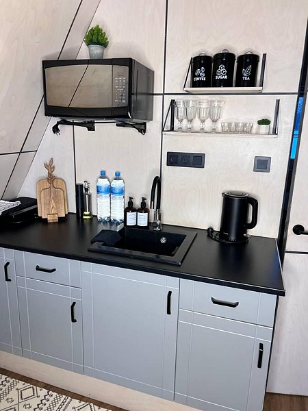 Кухня оборудована бытовой техникой, чтобы гости смогли приготовить любимые блюда. Есть плита, холодильник, чайник, микроволновая печь, а также необходимый набор посуды.