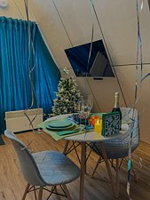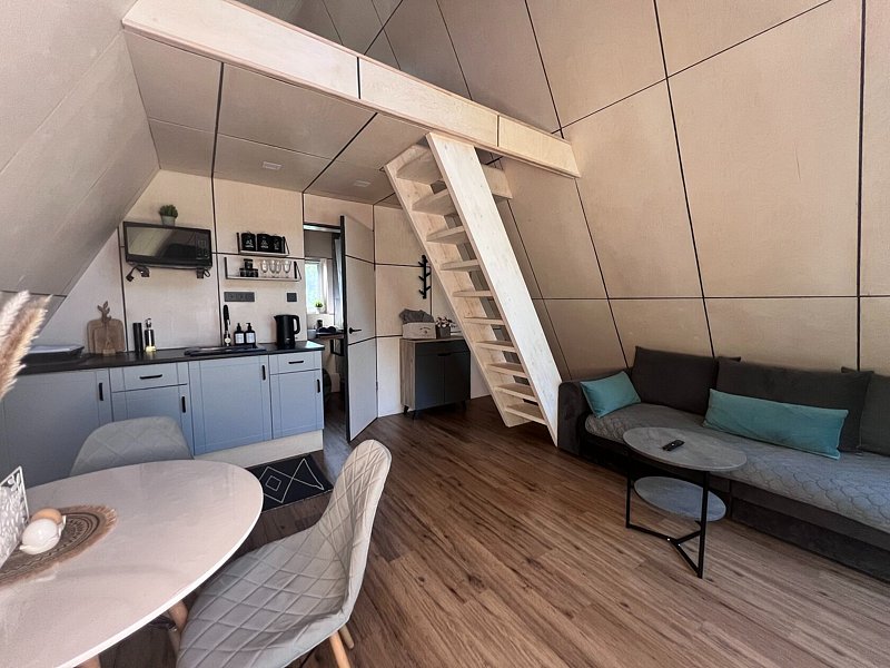 Дом рассчитан на 4 человек, полноценное двуспальное место на втором этаже и большой шикарный диван на первом этаже.