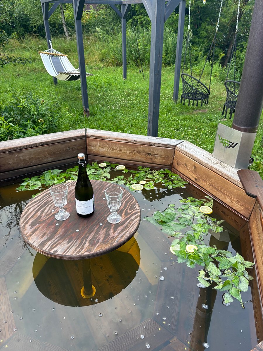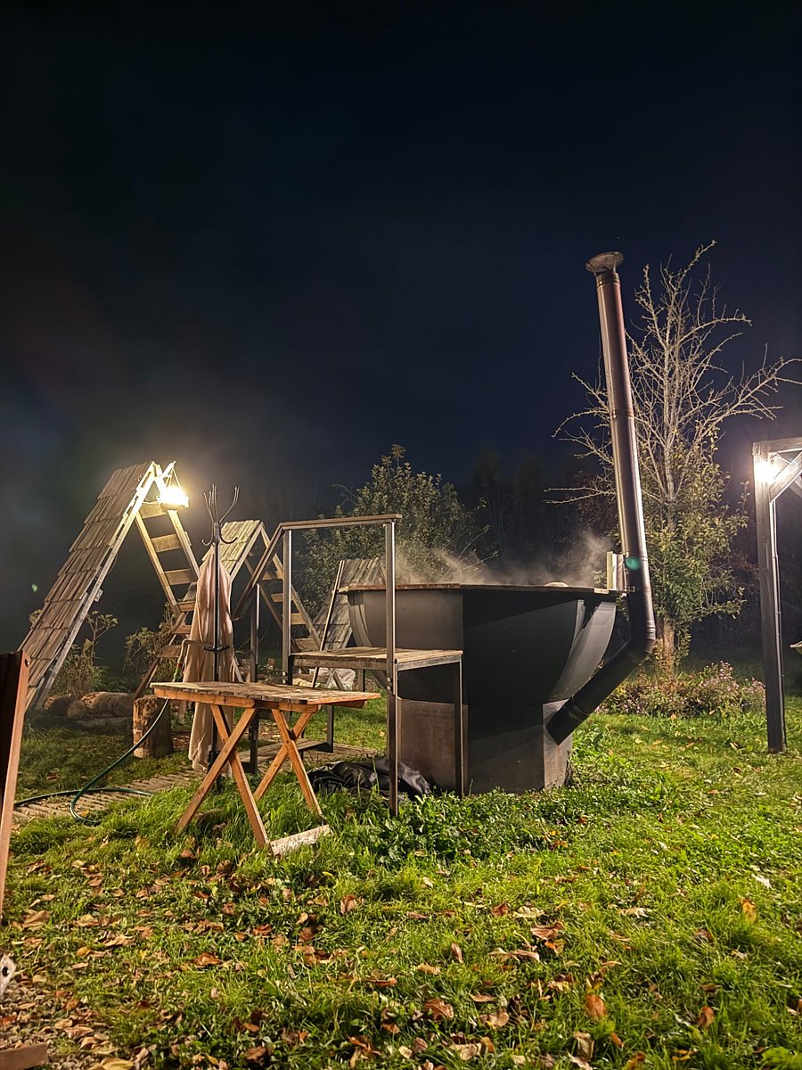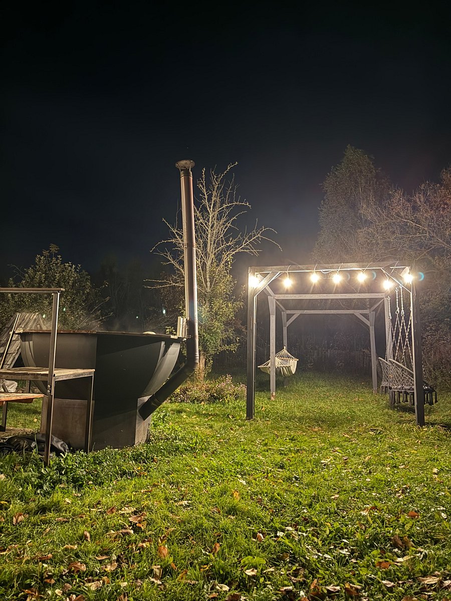 На прилегающей территории обустроена мангальная зона, а уголь и розжиг можно приобрести на месте. Расслабиться можно в банном чане на открытом воздухе.