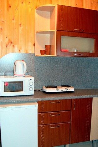 Спальня с двуспальной кроватью, спальня с двумя полутороспальными кроватями, кухня с кухонным гарнитуром, санузел, телевизор, электрическая плита, электрический чайник, холодильник, комплект посуды на шесть человек. Возле дома находится большая беседка и мангал.
