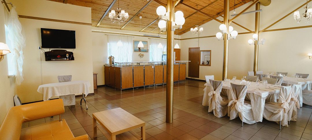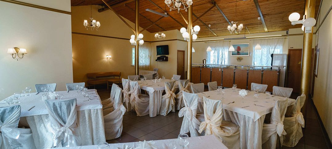 Светлый, праздничный и просторный банкетный зал, в котором Вы сможете отпраздновать любое торжество: свадьбу, корпоратив, юбилей, день рождения, выпускной.