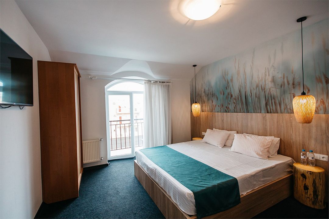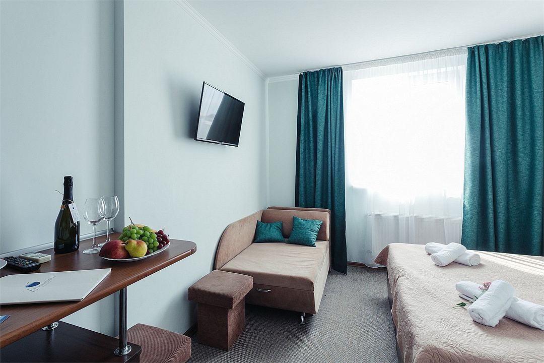 Однокомнатный комфортный номер площадью 16-18 м² с панорамным видом на море/город и уютным балконом прекрасно подойдет для размещения семейной пары и двоих детей до 14 лет. Номер оснащен удобной двуспальной кроватью с комфортным матрасом (кровать- трансформер, при необходимости можем сделать две отдельные - укажите это при бронировании). Так же предусмотрено дополнительное место в виде раскладного дивана. Для вашего удобства в номере есть гардеробный шкаф, прикроватные тумбочки, стул, журнальный стол, телевизор, мини-холодильник, чайная станция набор (чайник, чай/кофе/сахар/шоколад, чашки, стаканы), вешалка настенная. В ванной комнате установлена душевая кабина, есть фен, полотенцесушитель, комплект косметических принадлежностей, набор полотенец. На каждом этаже есть кулер и гладильная зона, за дополнительную плату вещи можно сдать в прачечную. Обращаем внимание, что размеры и дизайн номеров могут варьироваться - представленные фотографии не соответствует каждому номеру данной категории.Услуги и удобства