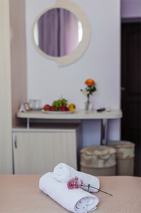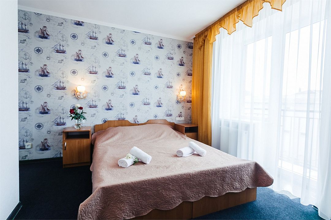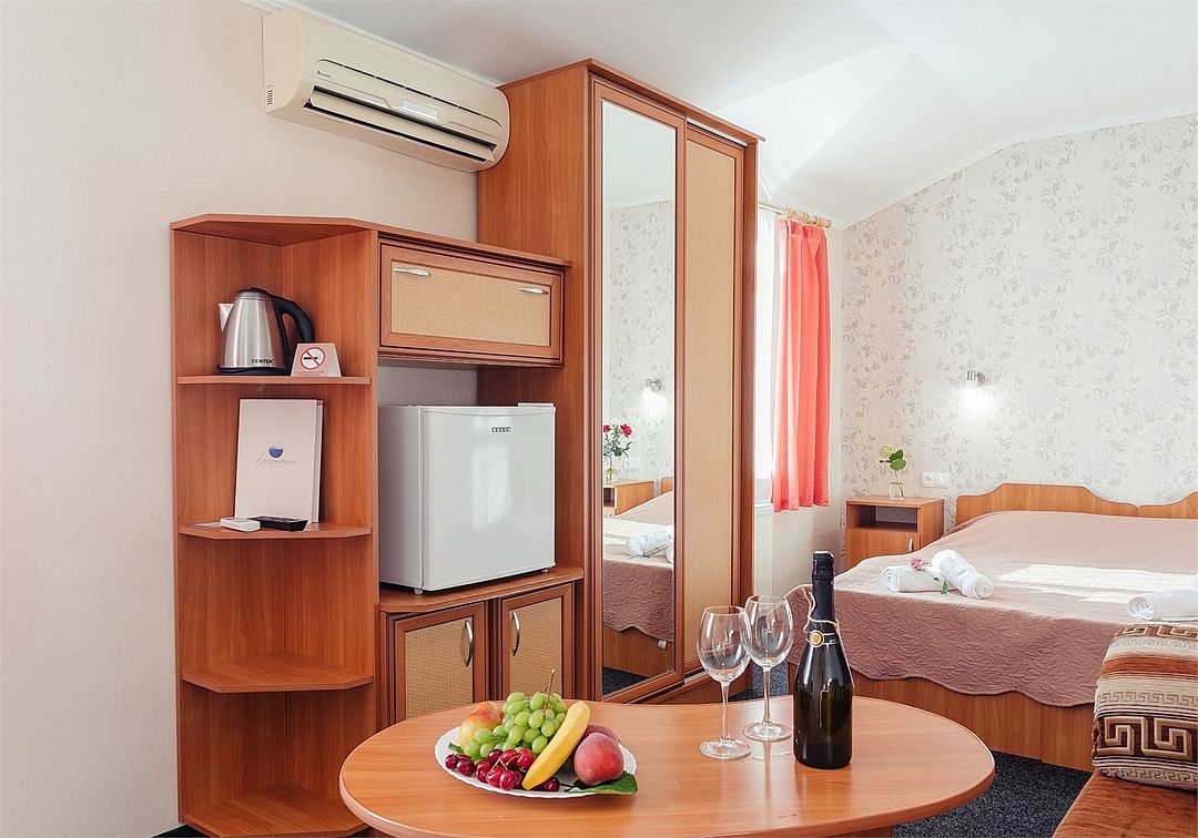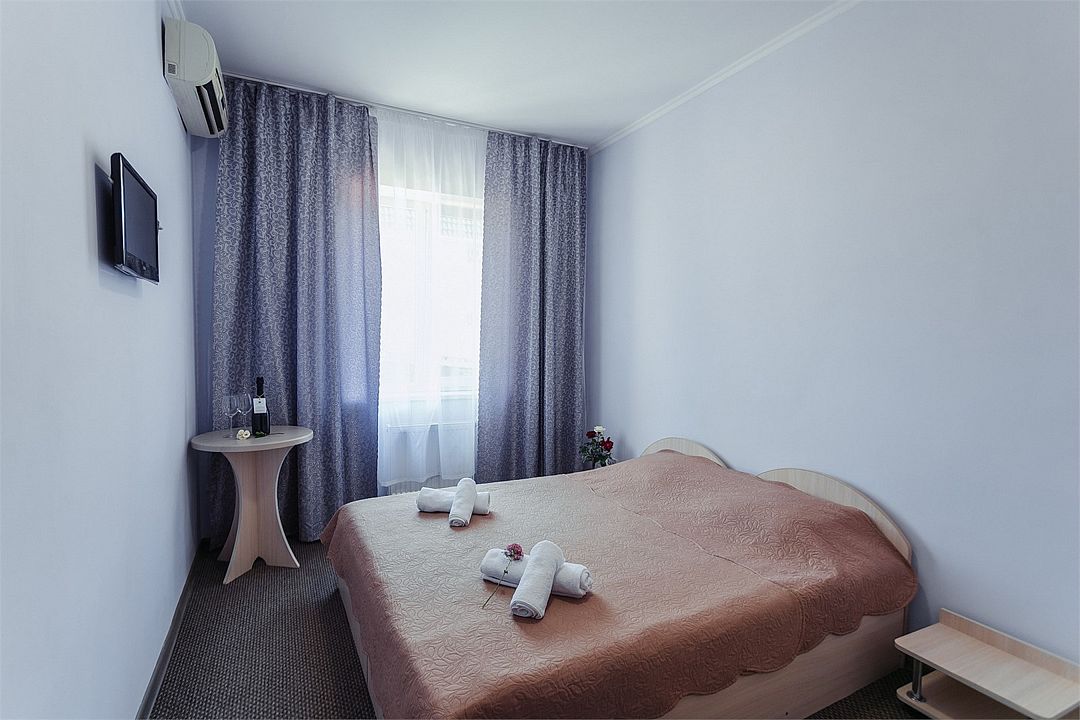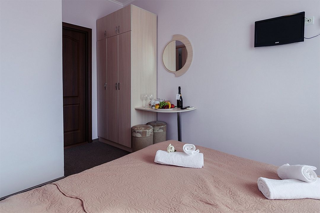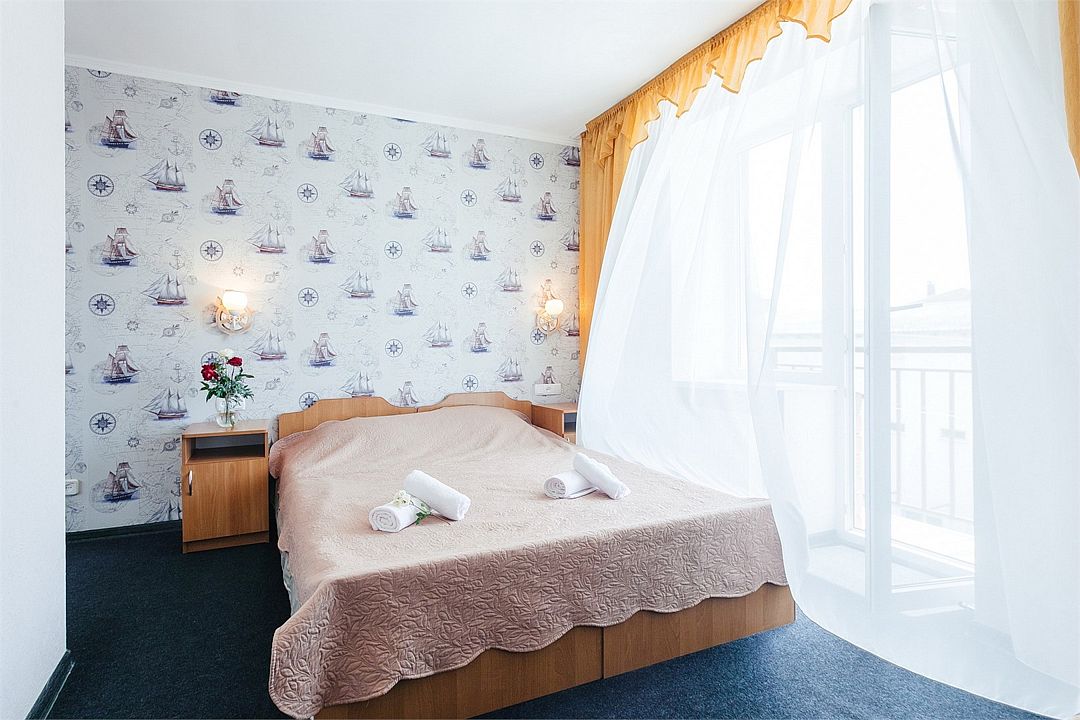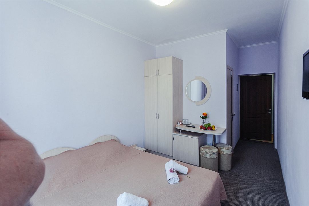 Однокомнатный комфортный номер площадью 16-18 м² с панорамным видом на море/город и уютным балконом прекрасно подойдет для размещения трёх взрослых или семейной пары с ребенком. Номер оснащен удобной двуспальной кроватью с комфортным матрасом (кровать- трансформер, при необходимости можем сделать две отдельные - укажите это при бронировании). Так же предусмотрено дополнительное место в виде раскладного кресла или небольшого дивана. Для вашего удобства в номере есть гардеробный шкаф, прикроватные тумбочки, стул, журнальный стол, телевизор, мини-холодильник, чайная станция набор (чайник, чай/кофе/сахар/шоколад, чашки, стаканы), вешалка настенная. В ванной комнате установлена душевая кабина, есть фен, полотенцесушитель, комплект косметических принадлежностей, набор полотенец. На каждом этаже есть кулер и гладильная зона, за дополнительную плату вещи можно сдать в прачечную. Обращаем внимание, что размеры и дизайн номеров могут варьироваться - представленные фотографии не соответствует каждому номеру данной категории.Услуги и удобства