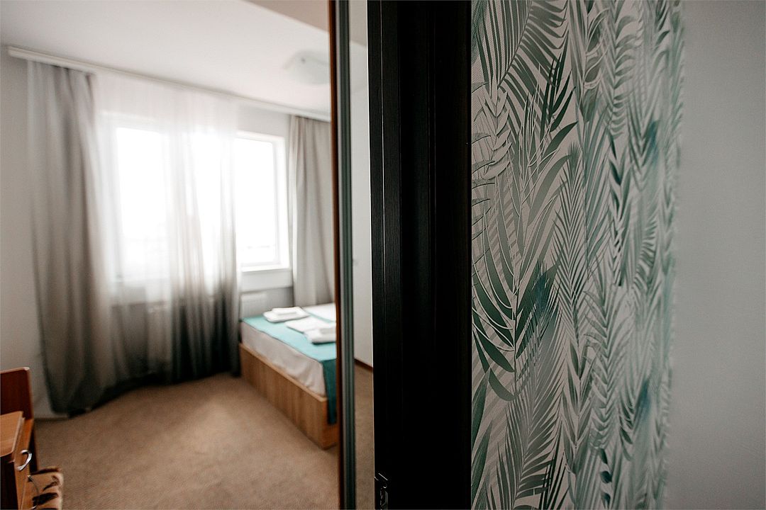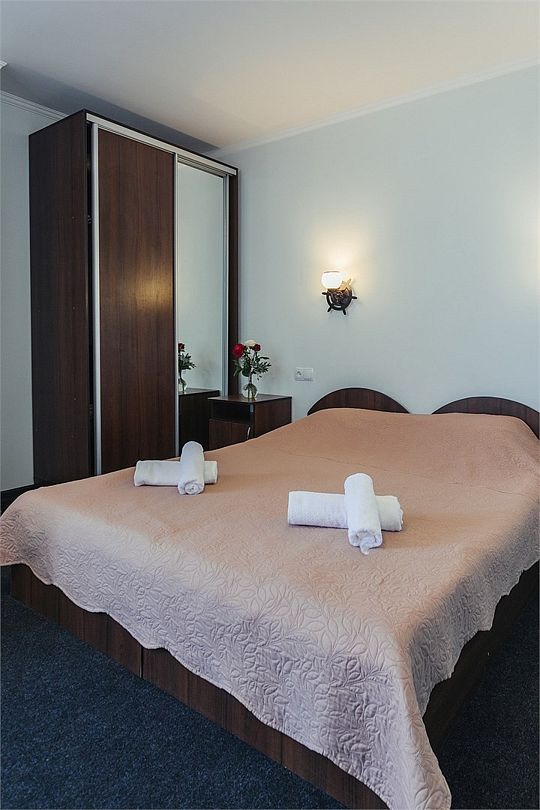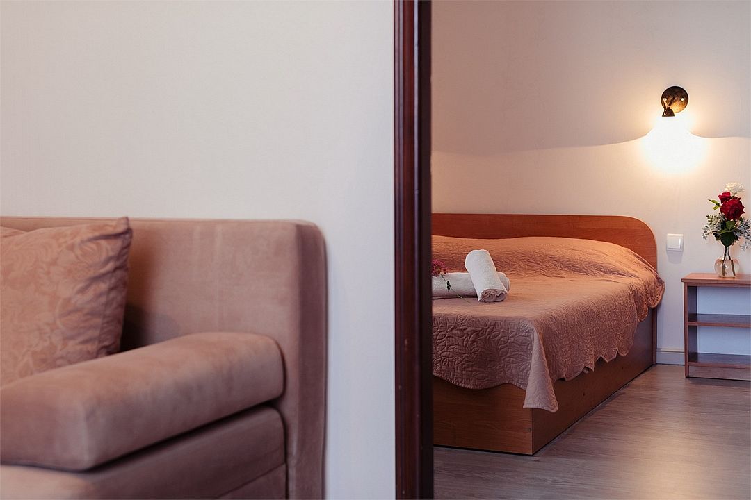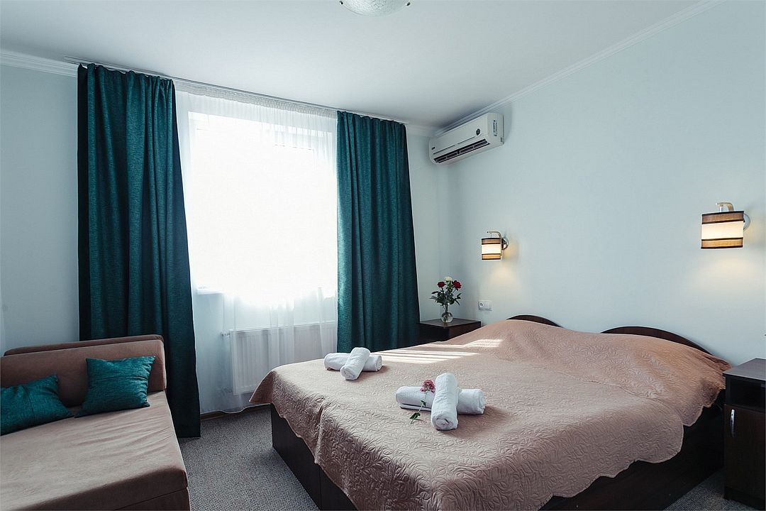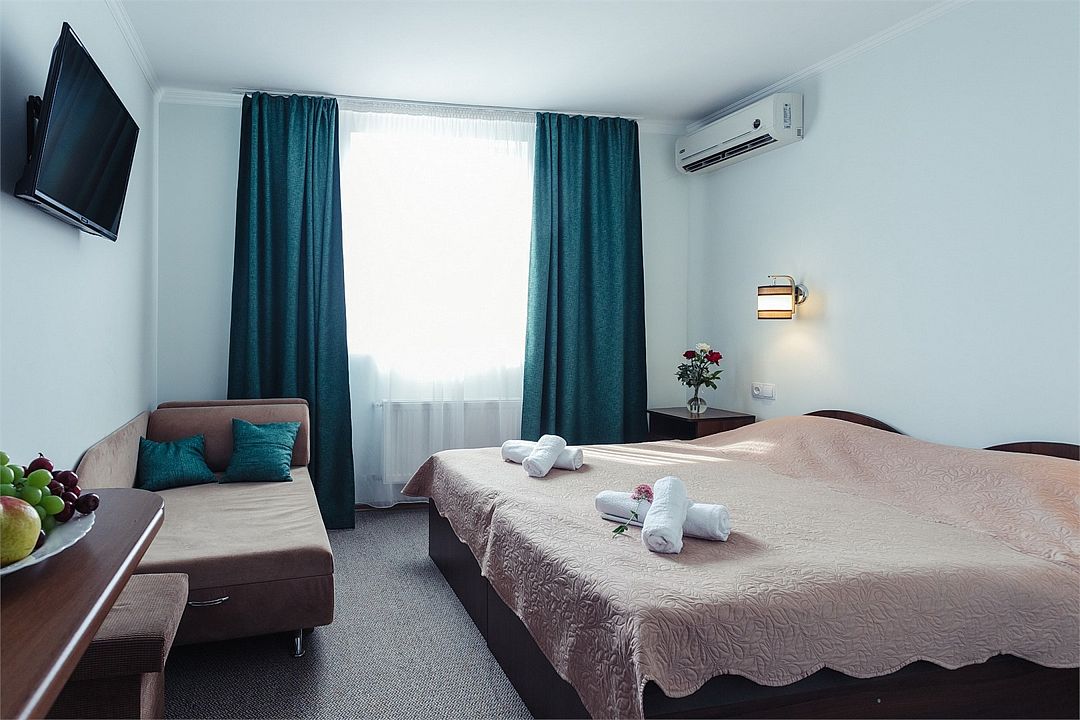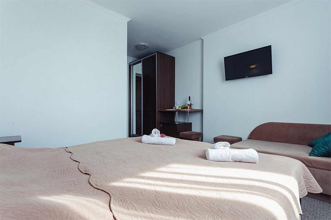 Просторный номер площадью 24-26 м² с оснащен удобной двуспальной кроватью с комфортным матрасом (кровать- трансформер, при необходимости можем сделать две отдельные - укажите это при бронировании) и раскладным диваном размером 160х190 см. В номере есть выход на отдельный балкон из спальни. Для вашего удобства в номере есть гардеробный шкаф, прикроватные тумбочки, стул, журнальный стол, телевизор, мини-холодильник, чайная станция набор (чайник, чай/кофе/сахар/шоколад, чашки, стаканы), вешалка настенная. В ванной комнате установлена душевая кабина, есть фен, полотенцесушитель, комплект косметических принадлежностей, набор полотенец. На каждом этаже есть кулер и гладильная зона, за дополнительную плату вещи можно сдать в прачечную. Обращаем внимание, что размеры и дизайн номеров могут варьироваться - представленные фотографии не соответствует каждому номеру данной категории.Услуги и удобства