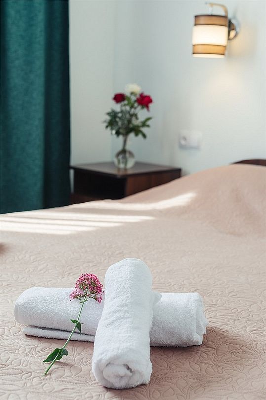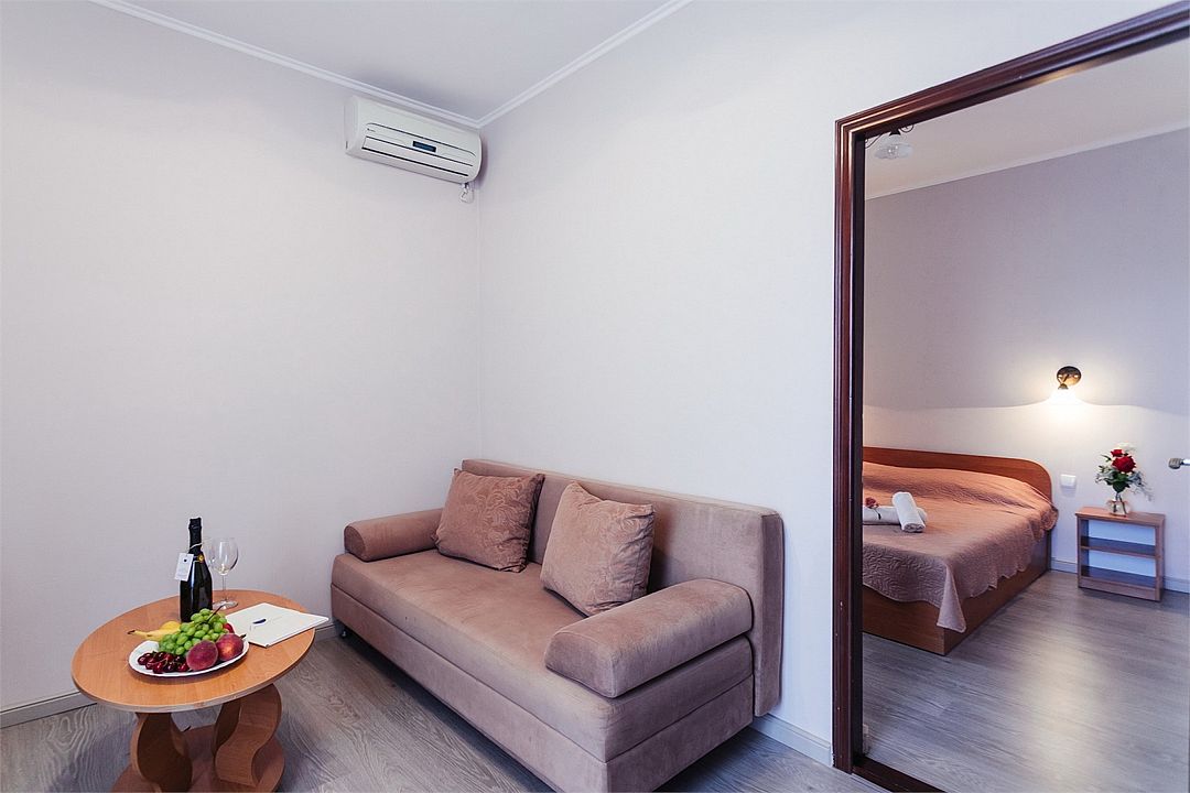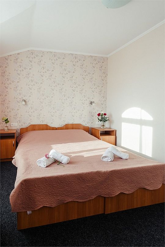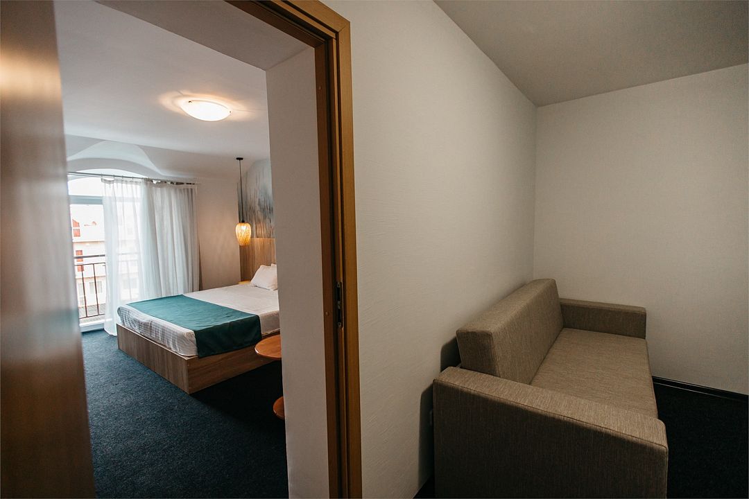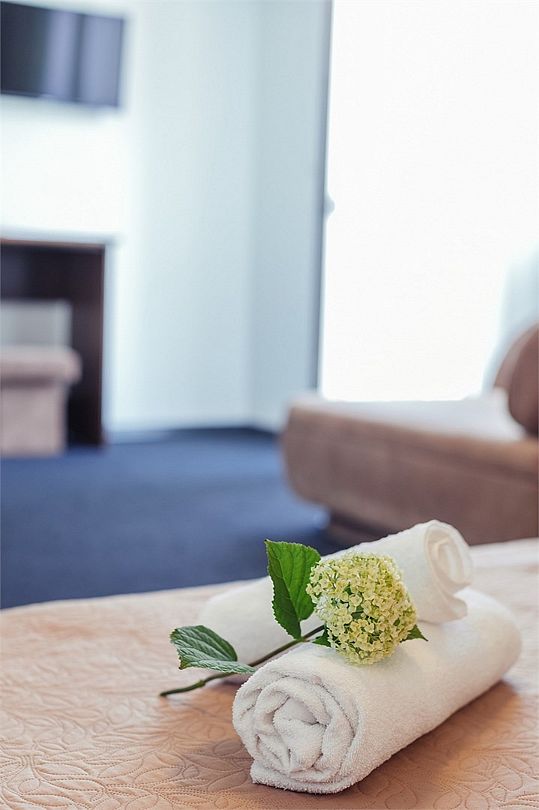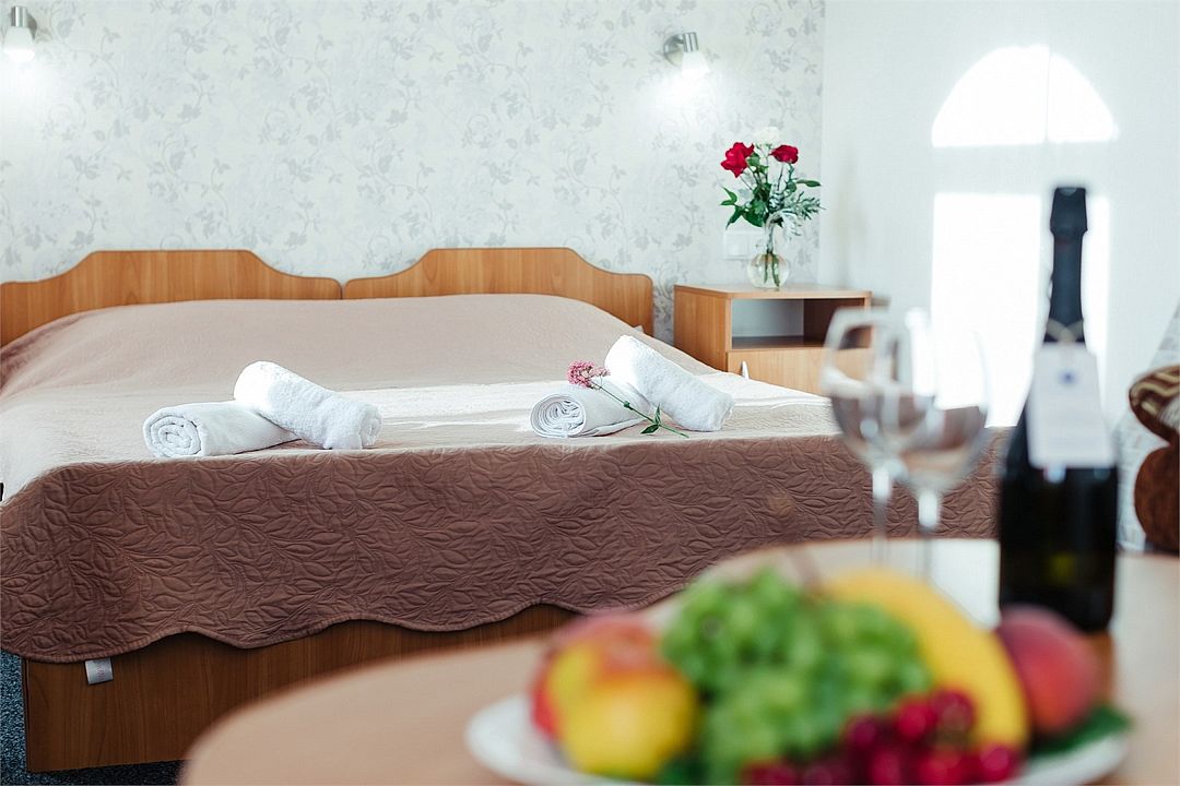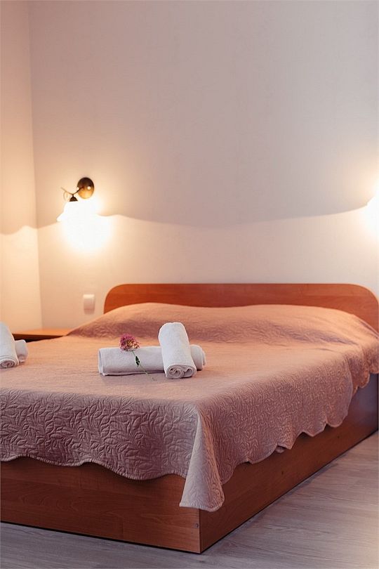 Просторный номер площадью 24-26 м² с оснащен удобной двуспальной кроватью с комфортным матрасом (кровать- трансформер, при необходимости можем сделать две отдельные - укажите это при бронировании) и раскладным диваном размером 160х190 см. В номере есть выход на отдельный балкон из спальни. Для вашего удобства в номере есть гардеробный шкаф, прикроватные тумбочки, стул, журнальный стол, телевизор, мини-холодильник, чайная станция набор (чайник, чай/кофе/сахар/шоколад, чашки, стаканы), вешалка настенная. В ванной комнате установлена душевая кабина, есть фен, полотенцесушитель, комплект косметических принадлежностей, набор полотенец. На каждом этаже есть кулер и гладильная зона, за дополнительную плату вещи можно сдать в прачечную. Обращаем внимание, что размеры и дизайн номеров могут варьироваться - представленные фотографии не соответствует каждому номеру данной категории.Услуги и удобства