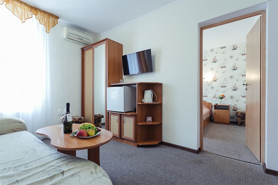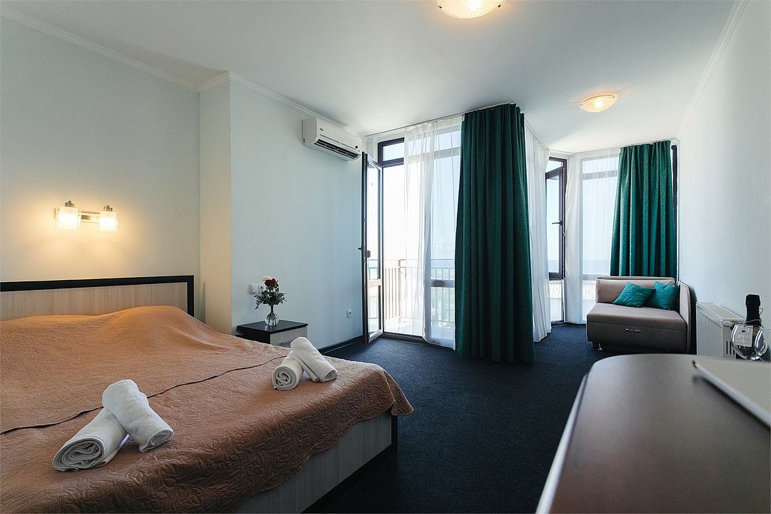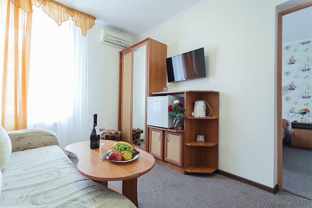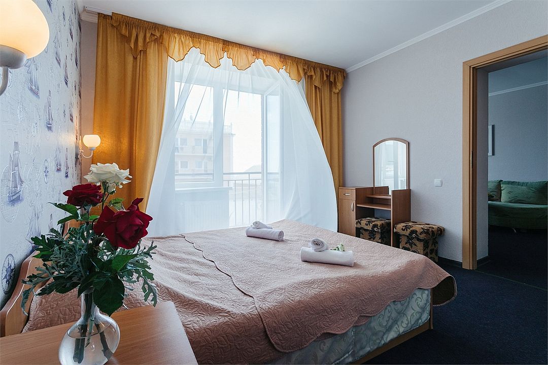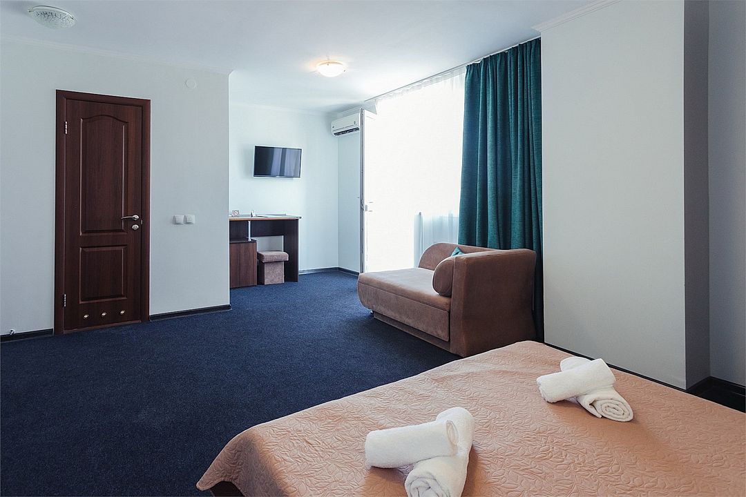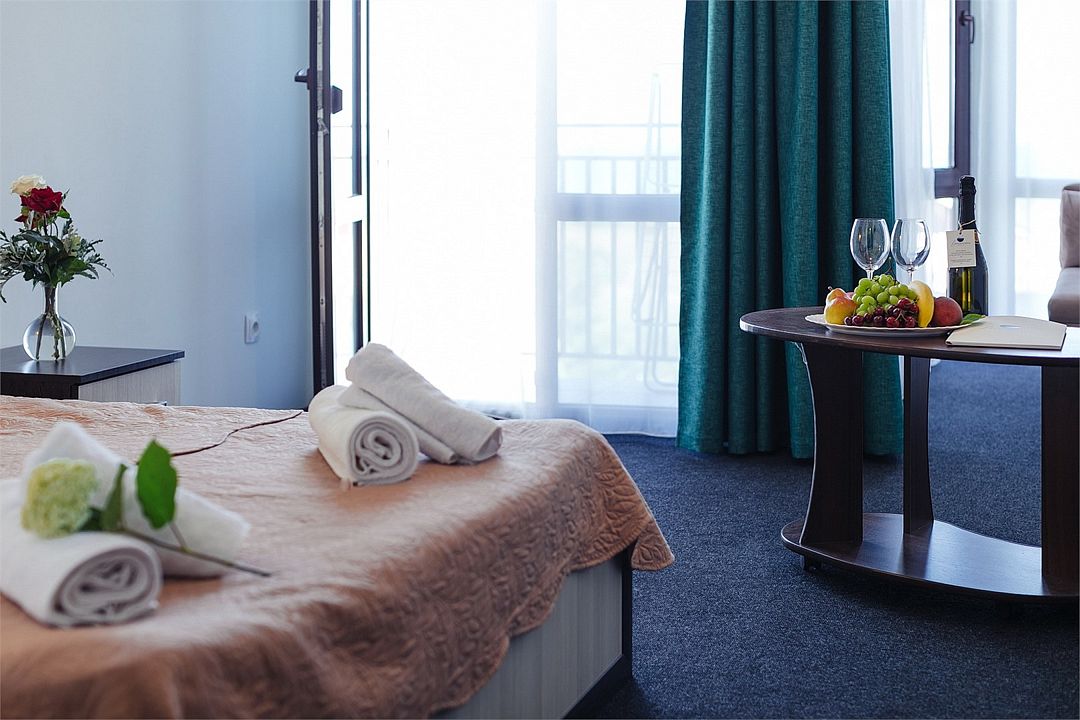 Просторный номер площадью 37 м² с оснащен удобной двуспальной кроватью с комфортным матрасом (кровать- трансформер, при необходимости можем сделать две отдельные - укажите это при бронировании) и раскладным диваном размером 160х190 см. В номере есть просторная гостиная с кухонной зоной имеющая выход на отдельный балкон с видом на море. Для вашего удобства в номере есть гардеробный шкаф, прикроватные тумбочки, стул, журнальный стол, телевизор, мини-холодильник, чайная станция набор (чайник, чай/кофе/сахар/шоколад, чашки, стаканы), вешалка настенная. В ванной комнате установлена душевая кабина, есть фен, полотенцесушитель, комплект косметических принадлежностей, набор полотенец. На каждом этаже есть кулер и гладильная зона, за дополнительную плату вещи можно сдать в прачечную. Обращаем внимание, что представленные фотографии не соответствует каждому номеру данной категории.Услуги и удобства