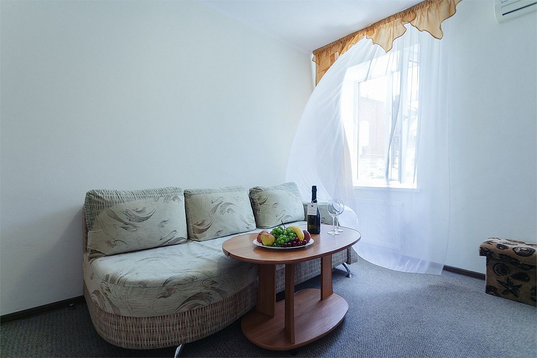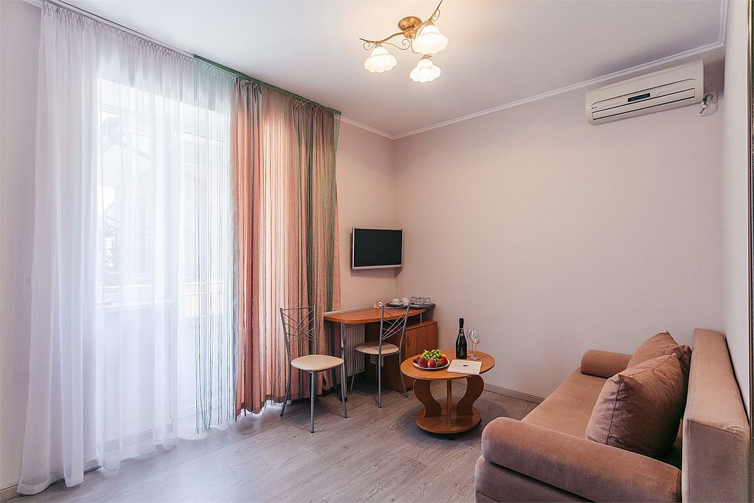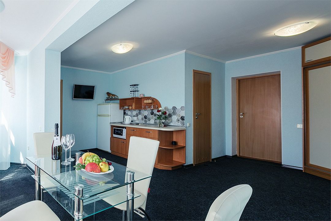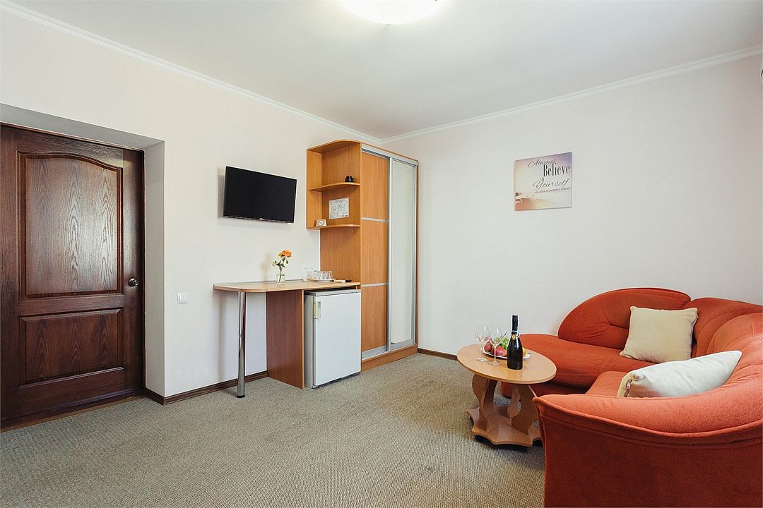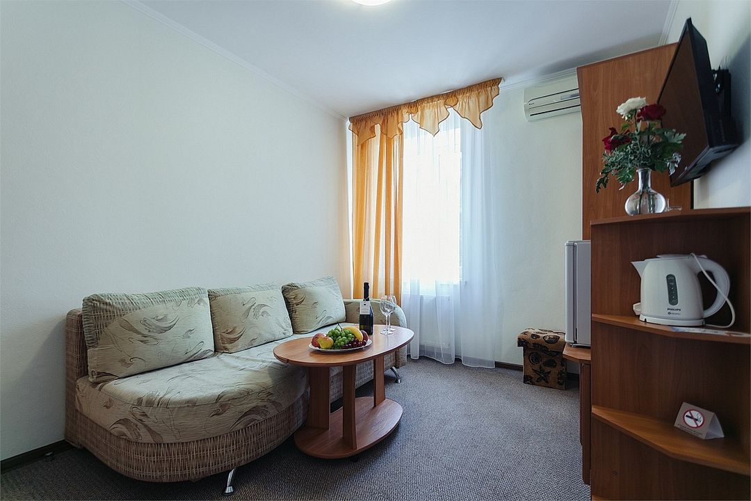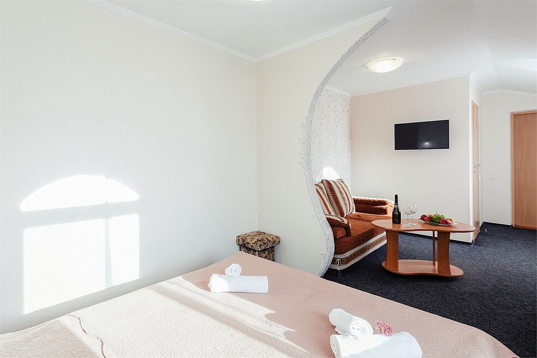 Просторный номер площадью 37 м² с оснащен удобной двуспальной кроватью с комфортным матрасом (кровать- трансформер, при необходимости можем сделать две отдельные - укажите это при бронировании) и раскладным диваном размером 160х190 см. В номере есть просторная гостиная с кухонной зоной имеющая выход на отдельный балкон с видом на море. Для вашего удобства в номере есть гардеробный шкаф, прикроватные тумбочки, стул, журнальный стол, телевизор, мини-холодильник, чайная станция набор (чайник, чай/кофе/сахар/шоколад, чашки, стаканы), вешалка настенная. В ванной комнате установлена душевая кабина, есть фен, полотенцесушитель, комплект косметических принадлежностей, набор полотенец. На каждом этаже есть кулер и гладильная зона, за дополнительную плату вещи можно сдать в прачечную. Обращаем внимание, что представленные фотографии не соответствует каждому номеру данной категории.Услуги и удобства