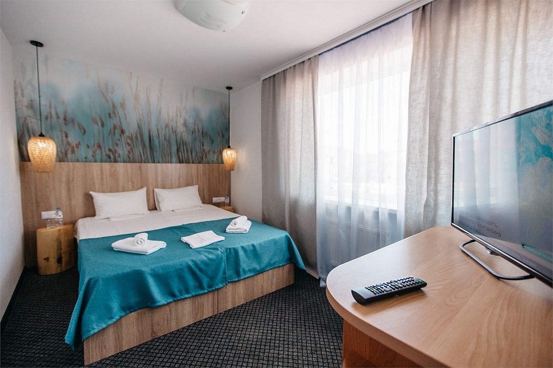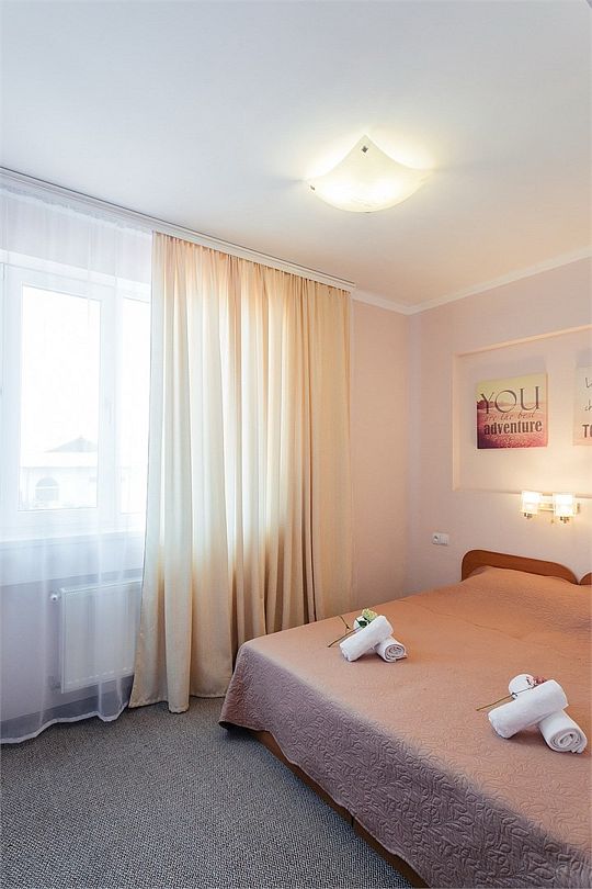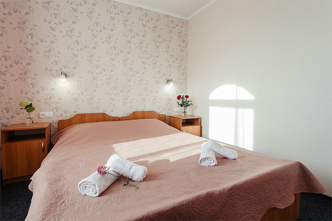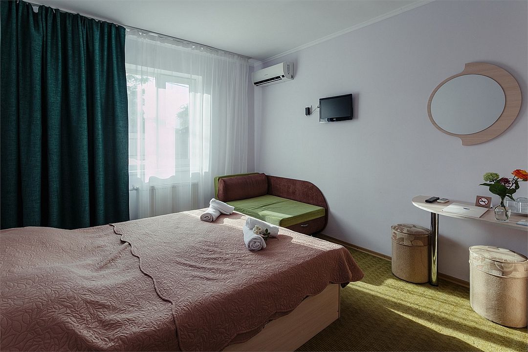 Однокомнатный уютный номер общей площадью 14-17 м² прекрасно подойдет для размещения четырех человек - двоих взрослых и 2 детей до 14 лет. Номер оснащен удобной двуспальной кроватью с комфортным матрасом (кровать- трансформер, при необходимости можем сделать две отдельные - укажите это при бронировании). Так же предусмотрено дополнительное место в виде раскладного дивана. Для вашего удобства в номере есть гардеробный шкаф, прикроватные тумбочки, стул, журнальный стол, телевизор, мини-холодильник, чайная станция набор (чайник, чай/кофе/сахар/шоколад, чашки, стаканы), вешалка настенная. В ванной комнате установлена душевая кабина, есть фен, полотенцесушитель, комплект косметических принадлежностей, набор полотенец. На каждом этаже есть кулер и гладильная зона, за дополнительную плату вещи можно сдать в прачечную. Обращаем внимание, что размеры и дизайн номеров могут варьироваться - представленные фотографии не соответствует каждому номеру данной категории.Услуги и удобства