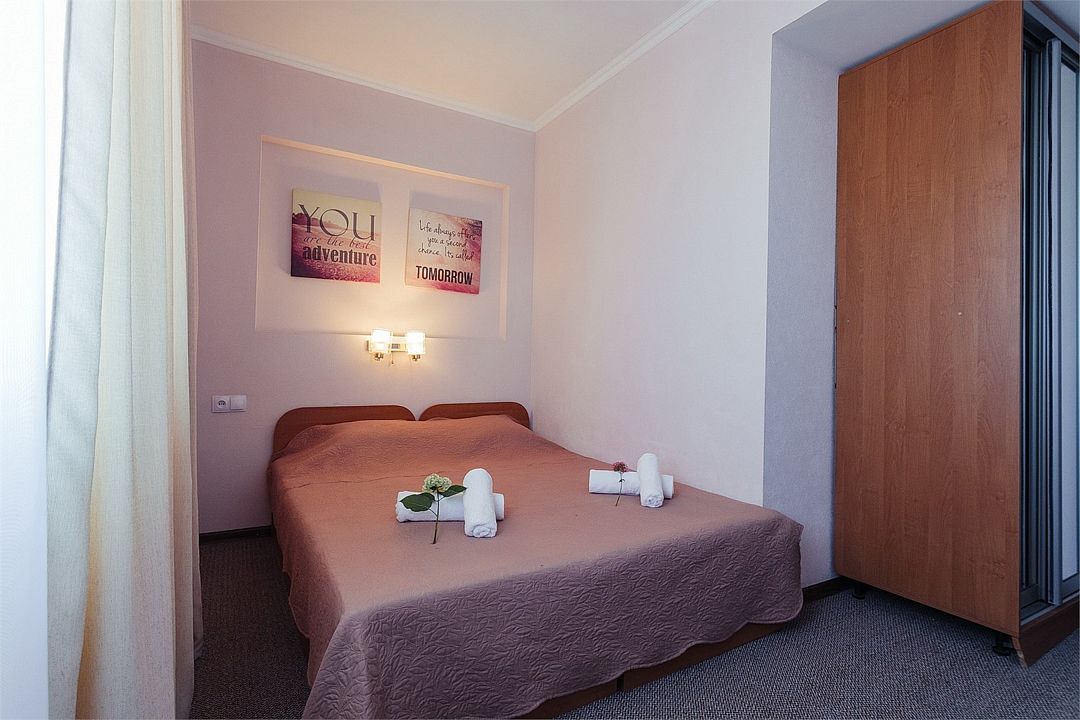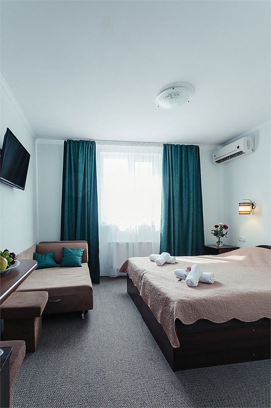 Однокомнатный уютный номер общей площадью 14-17 м² прекрасно подойдет для размещения четырех человек. Номер оснащен удобной двуспальной кроватью с комфортным матрасом (кровать- трансформер, при необходимости можем сделать две отдельные - укажите это при бронировании). Так же предусмотрено дополнительное место в виде раскладного дивана. Для вашего удобства в номере есть гардеробный шкаф, прикроватные тумбочки, стул, журнальный стол, телевизор, мини-холодильник, чайная станция набор (чайник, чай/кофе/сахар/шоколад, чашки, стаканы), вешалка настенная. В ванной комнате установлена душевая кабина, есть фен, полотенцесушитель, комплект косметических принадлежностей, набор полотенец. На каждом этаже есть кулер и гладильная зона, за дополнительную плату вещи можно сдать в прачечную. Обращаем внимание, что размеры и дизайн номеров могут варьироваться - представленные фотографии не соответствует каждому номеру данной категории.Услуги и удобства