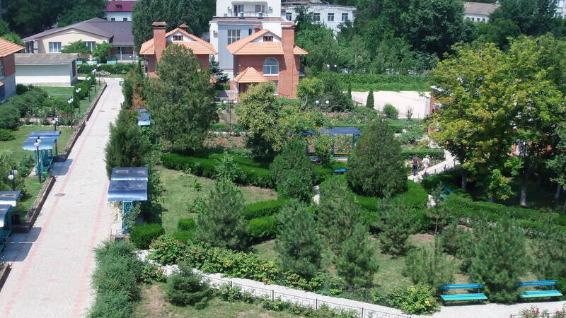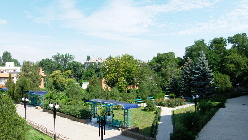 Территория пансионата благоустроена и озеленена. Здесь есть множество зон отдыха и уютных уголков. Специально для гостей есть библиотека, свой медпункт, парковка, а для детей предусмотрена игровая площадка.
