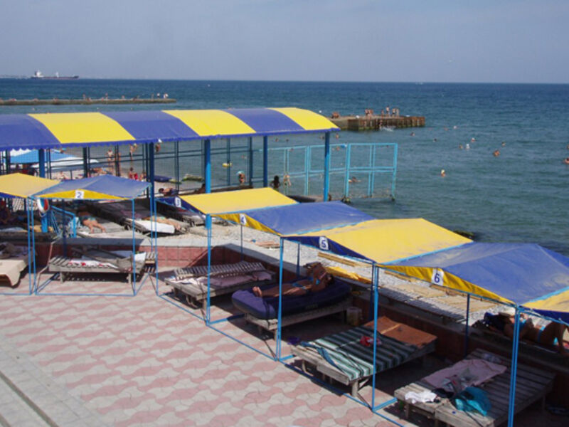 - второй уровень — палатки (домики) с пластиковыми шезлонгами, расположенными на солидном удалении друг от друга, так что наслаждаться солнцем и морским воздухом можно в приятной уединённости, также там находится санузел, раздевалка, душевые, медпункт;