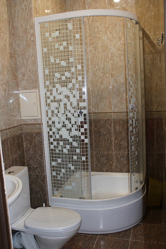 Индивидуальная ванная комната: душ, раковина, туалет.
