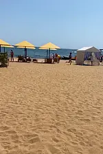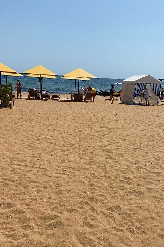 На пляже есть точки общественного питания: кафе и бары. Есть кабинки для переодевания и медпункт.