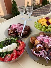 Разнообразные блюда домашней кухни. Каждый день готовятся завтраки, в течение дня — вкусная выпечка и блюда на мангале.