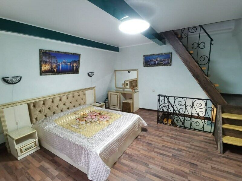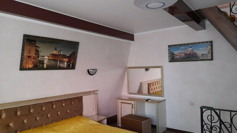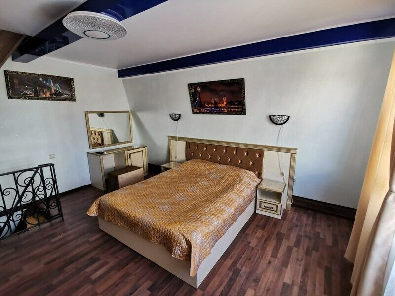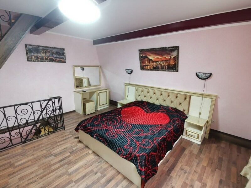Второй этаж-спальная комната, в которой находится двуспальная кровать 1,8 м. шириной, шкаф, туалетный столик с зеркалом, прикроватные тумбочки, телевизор, бра, балкон с видом на внутренний дворик.