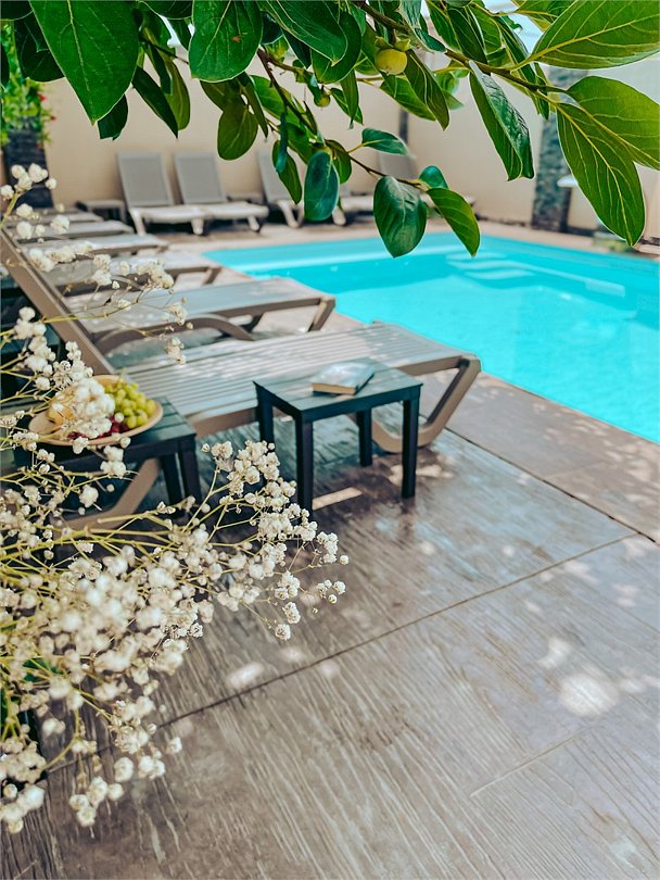 Wi-Fi, кондиционер, фен, две односпальные или большая двуспальная кровать, тумбы, шкаф для одежды, вешалки, зеркало, унитаз, раковина, отдельный вход в номер, душ, плиточное покрытие, вид во двор, туалетный столик, туалет, сушилка для белья, телевизор с плоским экраном, москитная сетка, гостиничная парфюмерия, номер для некурящих, пуфик, общественный бассейнВ номере