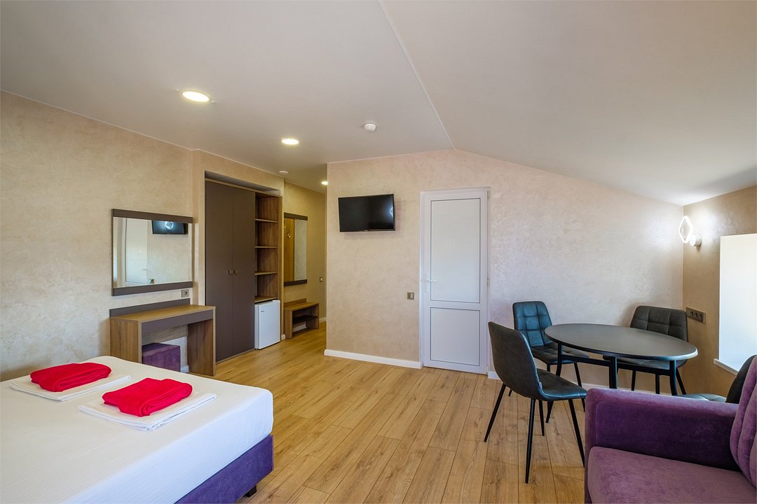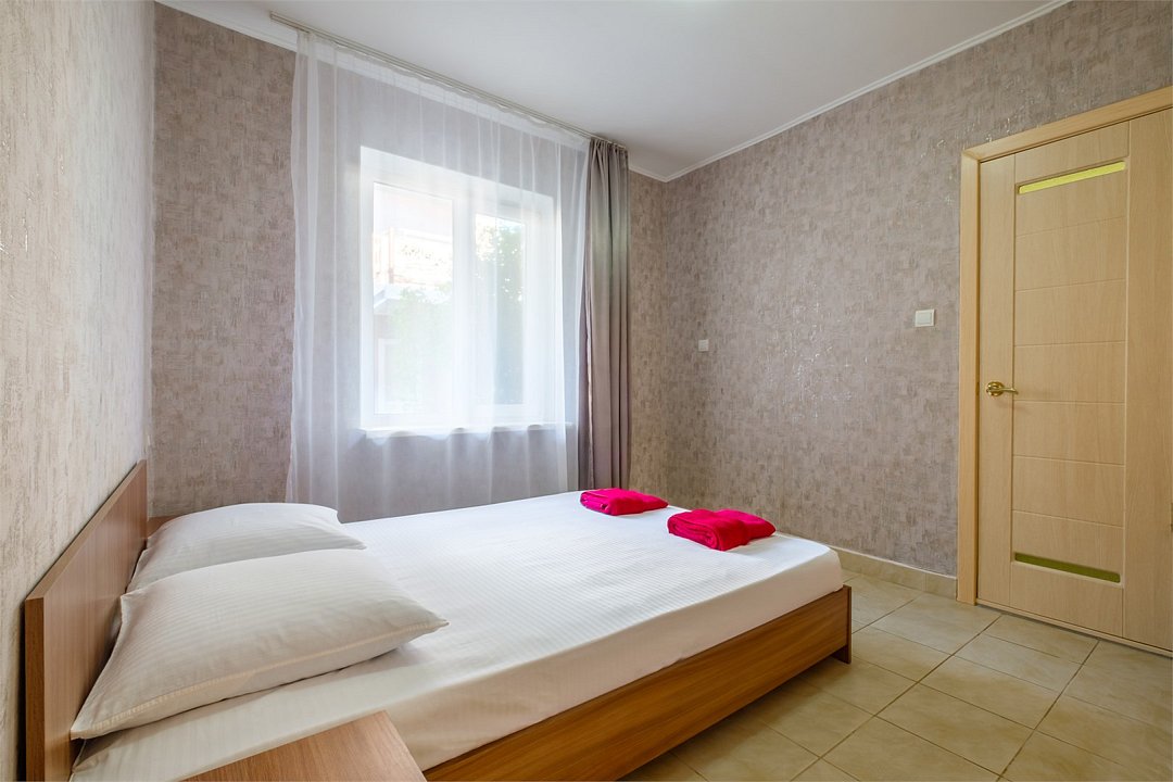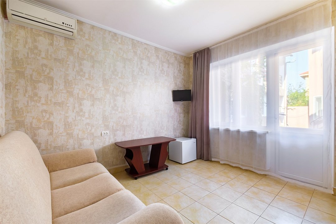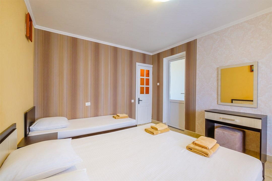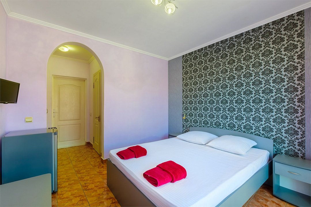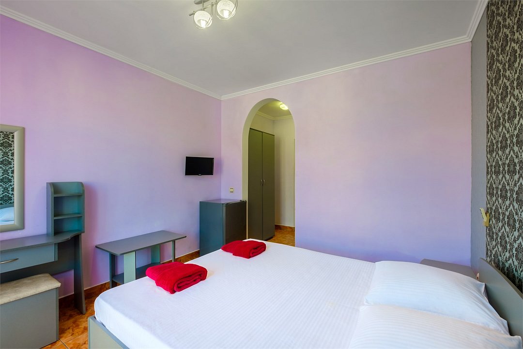 Однокомнатный номер с балконом и без, средней площадью 25-35 кв.м., санузел совмещенный в номере. Мебель в номере: двуспальная и односпальная кровати (или диван 2х спальный), прикроватные тумбы, шкаф, туалетный столик с пуфом, стол столовый с мини кухней (уточняйте), обувница с зеркалом и другая мебель. Техника: кондиционер, холодильник, телевизор, чайник, микроволновая печь, фен, стиральная машина (уточняйте о наличии конкретной техники). Так же в номере присутствуют: подушки и одеяла, постельное белье, полотенца на каждого человека по 2 шт., посуда, набор косметики для душа и т.д.Услуги и удобства