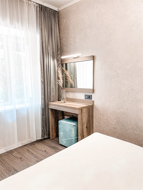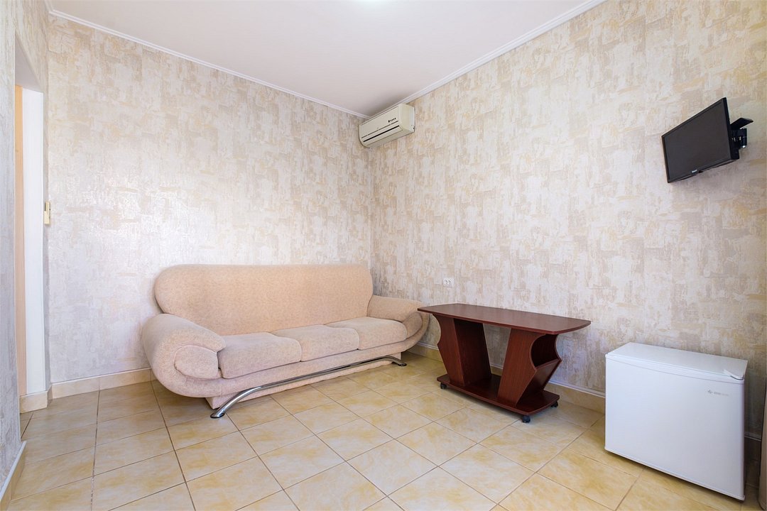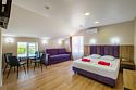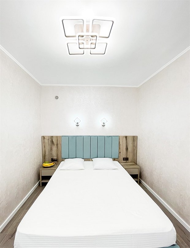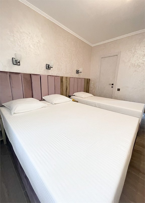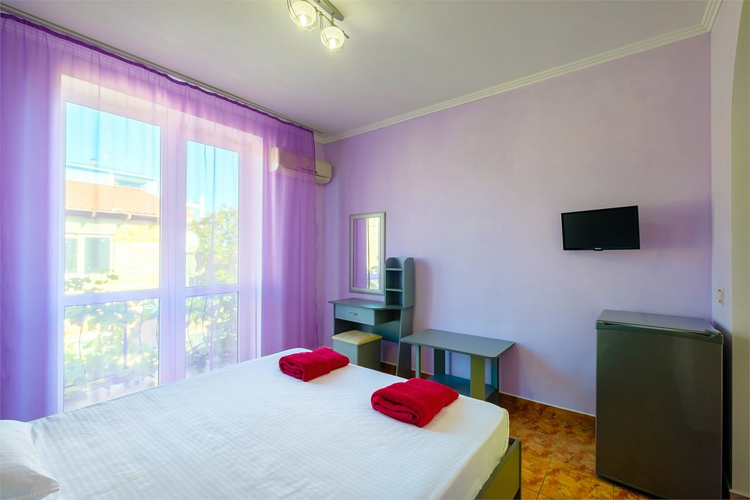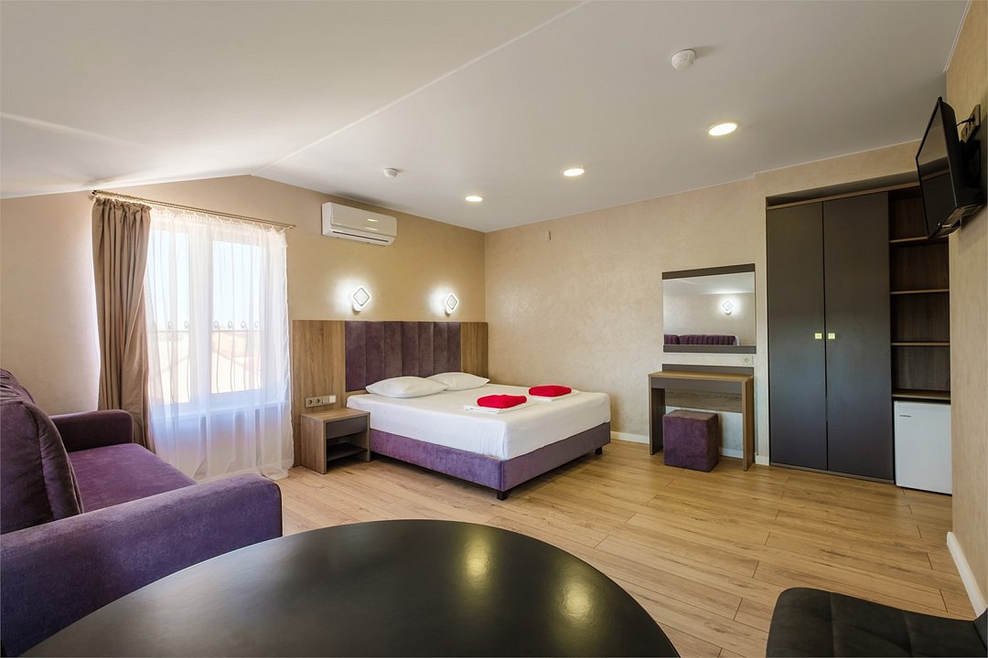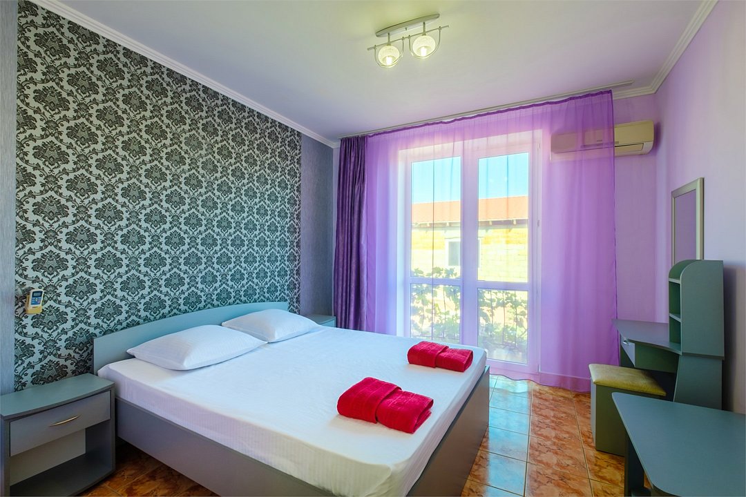 Однокомнатный номер с балконом и без, средней площадью 25-35 кв.м., санузел совмещенный в номере. Мебель в номере: двуспальная и односпальная кровати (или диван 2х спальный), прикроватные тумбы, шкаф, туалетный столик с пуфом, стол столовый с мини кухней (уточняйте), обувница с зеркалом и другая мебель. Техника: кондиционер, холодильник, телевизор, чайник, микроволновая печь, фен, стиральная машина (уточняйте о наличии конкретной техники). Так же в номере присутствуют: подушки и одеяла, постельное белье, полотенца на каждого человека по 2 шт., посуда, набор косметики для душа и т.д.Услуги и удобства