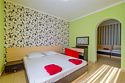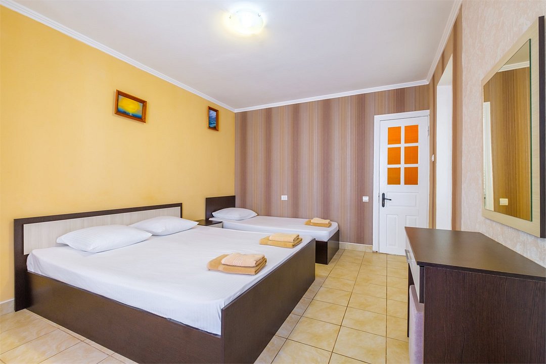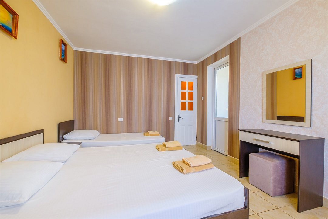 Однокомнатный номер с балконом и без, средней площадью 10-15 кв.м., санузел совмещенный в номере. Мебель в номере: двуспальная и односпальная кровати, прикроватные тумбы, шкаф, туалетный столик с пуфом, стол столовый с мини кухней (уточняйте), обувница с зеркалом и другая мебель. Техника: кондиционер, холодильник, телевизор, чайник, фен. Так же в номере присутствуют: подушки и одеяла, постельное белье, полотенца на каждого человека по 2 шт., посуда, набор косметики для душа и т.д.Услуги и удобства