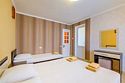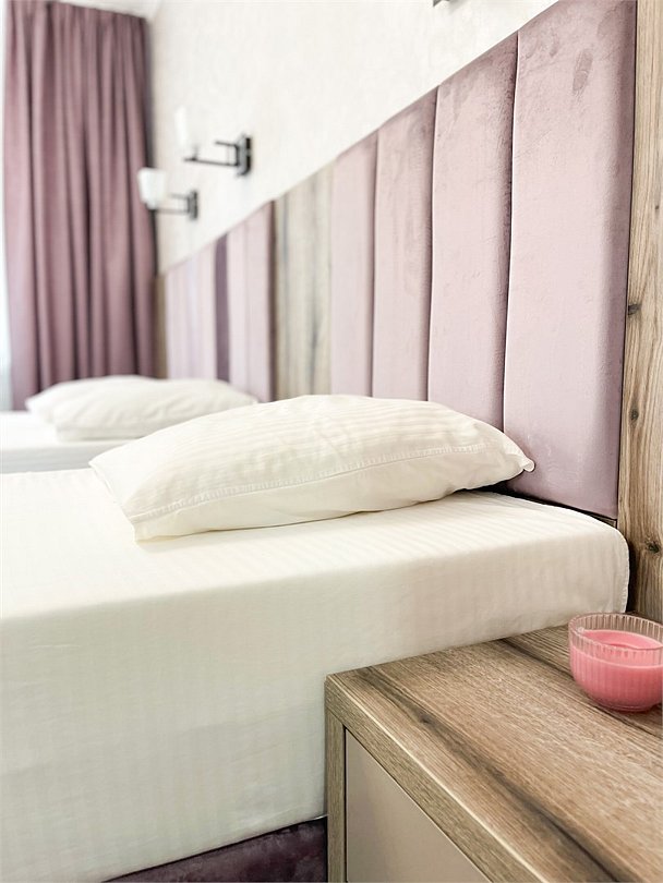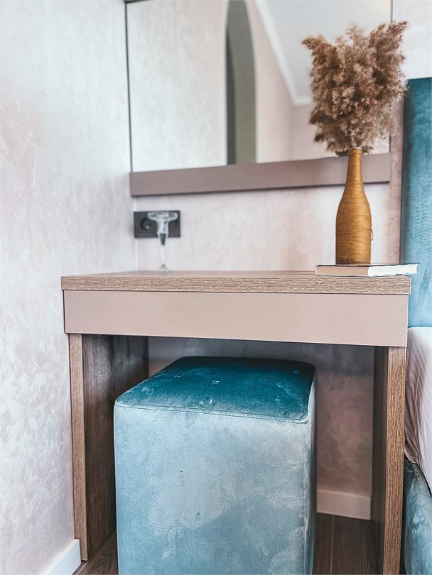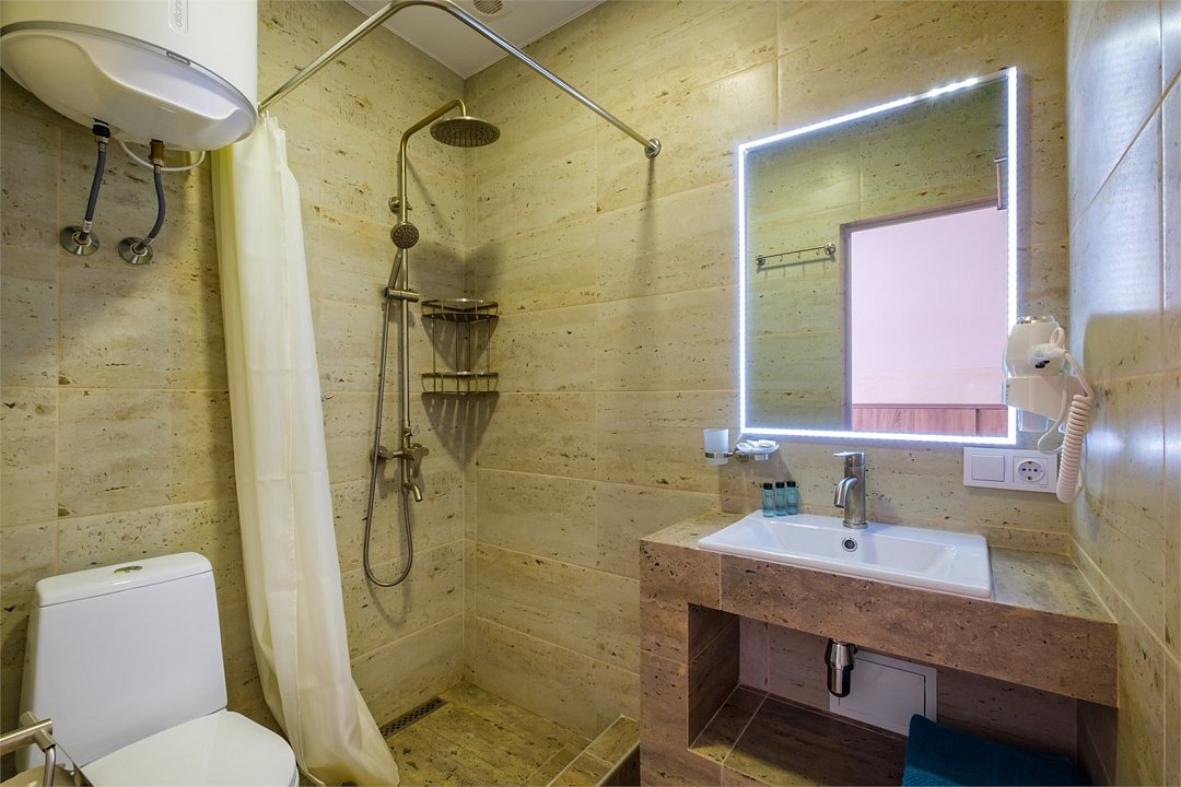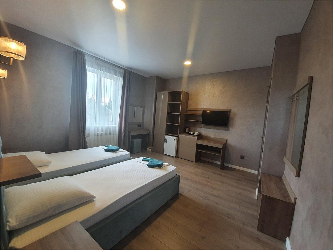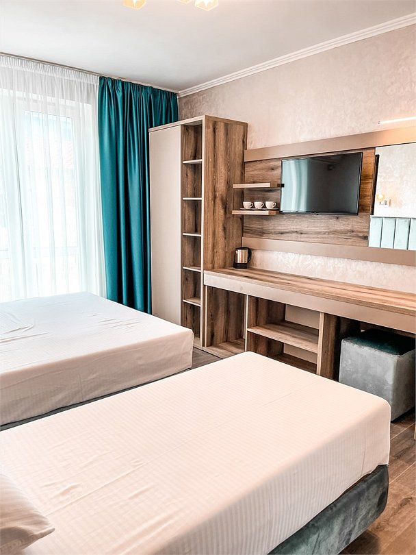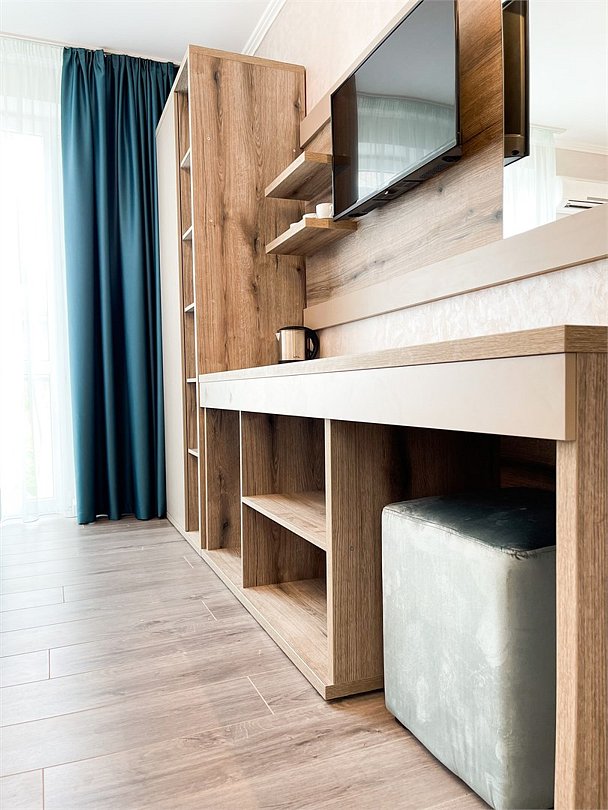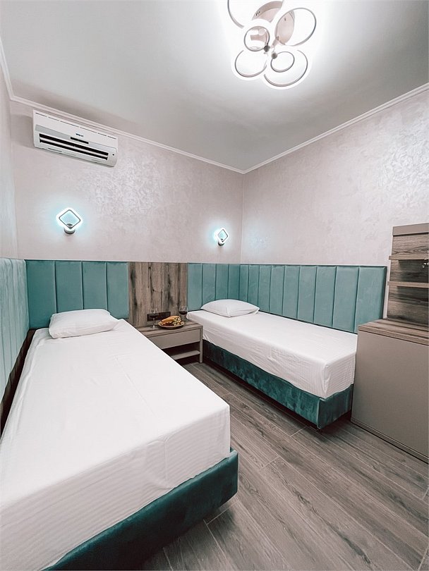 Однокомнатный номер с балконом и без, средней площадью 13-20 кв.м., санузел совмещенный в номере. Мебель в номере: двуспальная и односпальная кровати, прикроватные тумбы, шкаф, туалетный столик с пуфом, стол столовый с мини кухней (уточняйте), обувница с зеркалом и другая мебель. Техника: кондиционер, холодильник, телевизор, чайник, фен. Так же в номере присутствуют: подушки и одеяла, постельное белье, полотенца на каждого человека по 2 шт., посуда, набор косметики для душа и т.д.Услуги и удобства