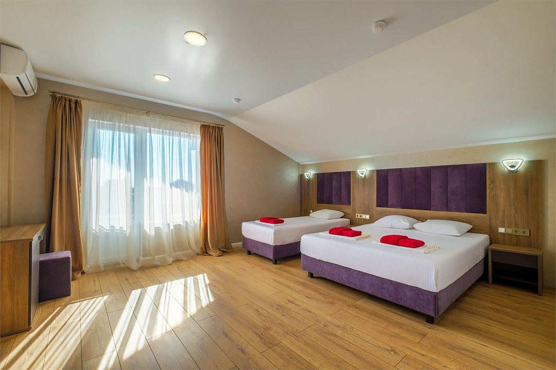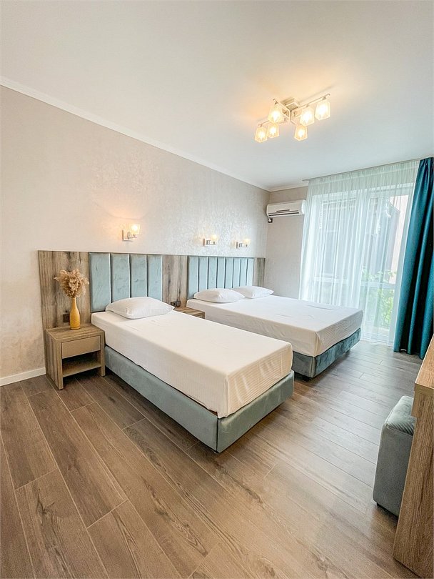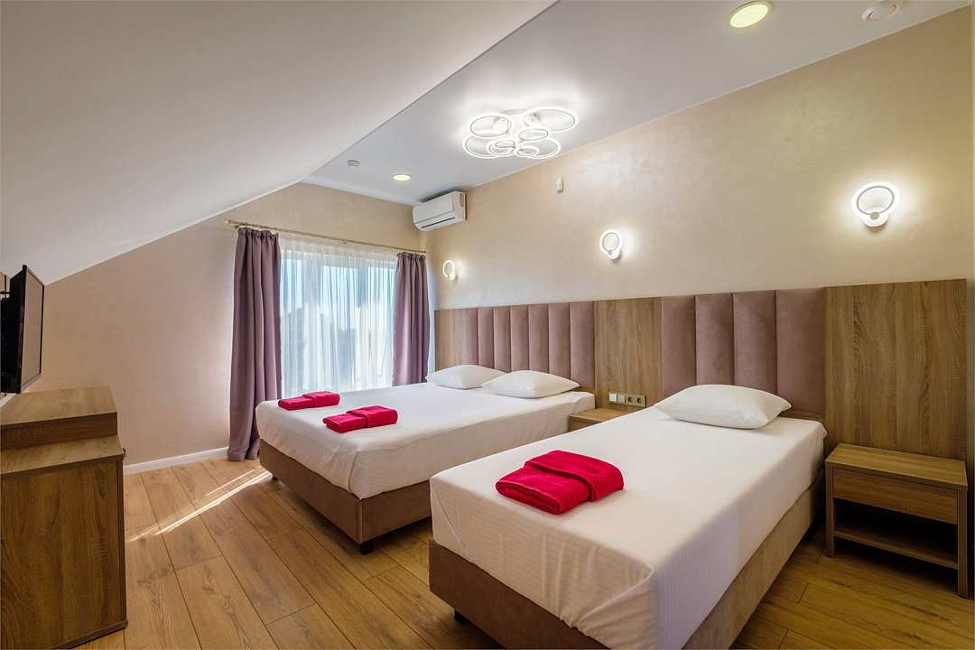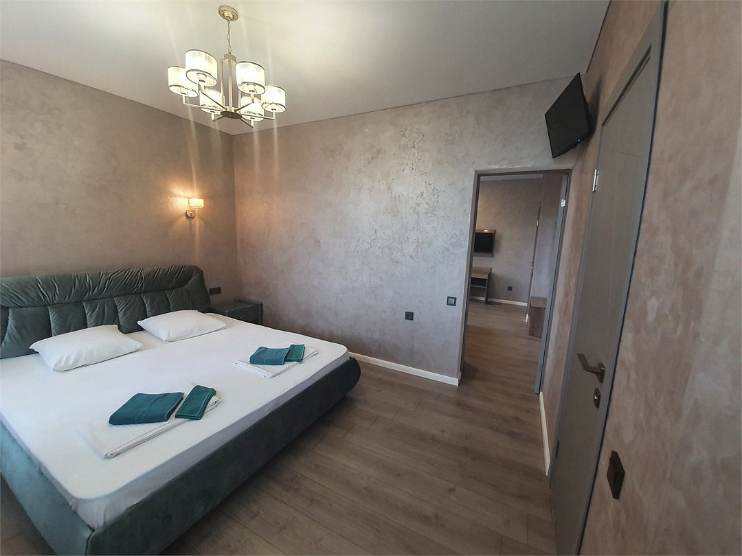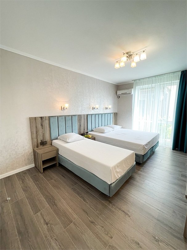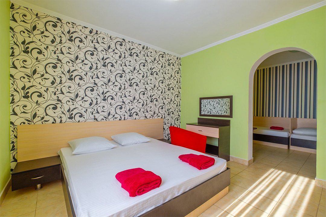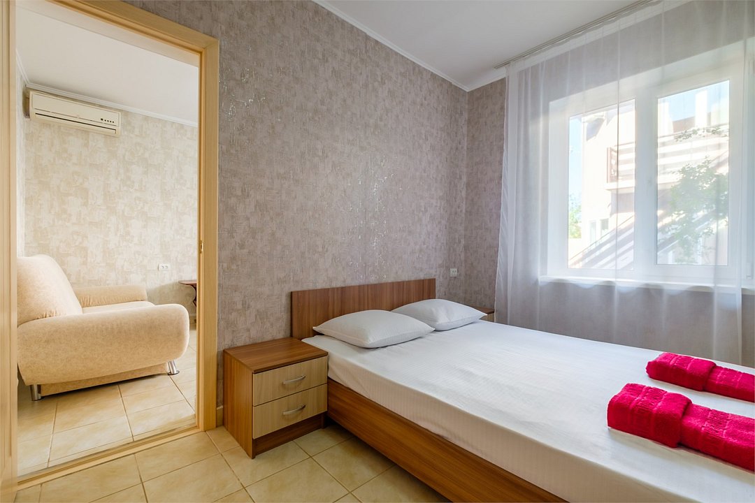 Двухкомнатный номер с балконом и без, средней площадью 30-40 кв.м., санузел совмещенный в номере. Мебель в номере: двуспальная и две односпальные кровати (или 2х спальный диван), прикроватные тумбы, шкаф, туалетный стол, стол столовый с мини кухней, обувница с зеркалом и другая мебель. Техника: кондиционер, холодильник, телевизор (в каждой комнате), чайник, микроволновая печь, фен, стиральная машина. Так же в номере присутствуют: подушки и одеяла, постельное белье, полотенца на каждого человека по 2 шт., посуда, набор косметики для душа и т.д.Услуги и удобства