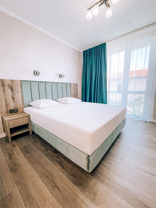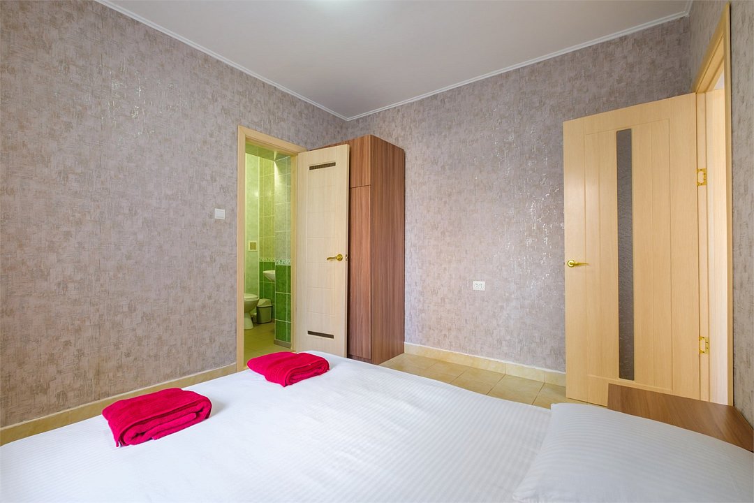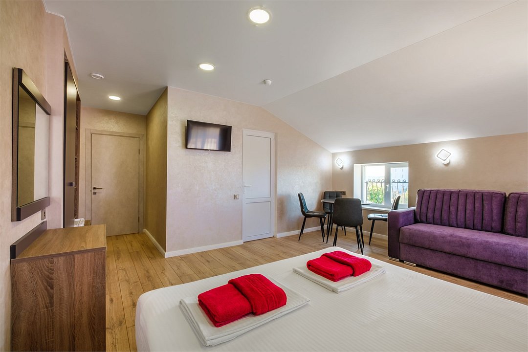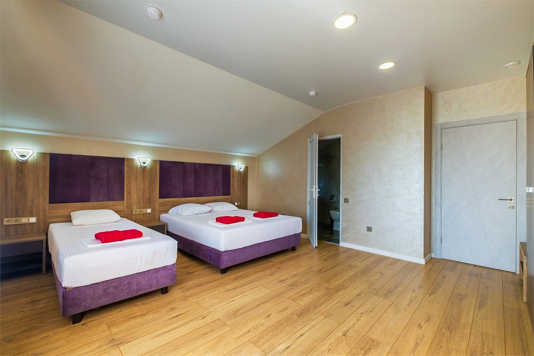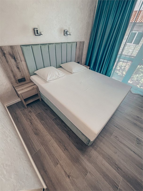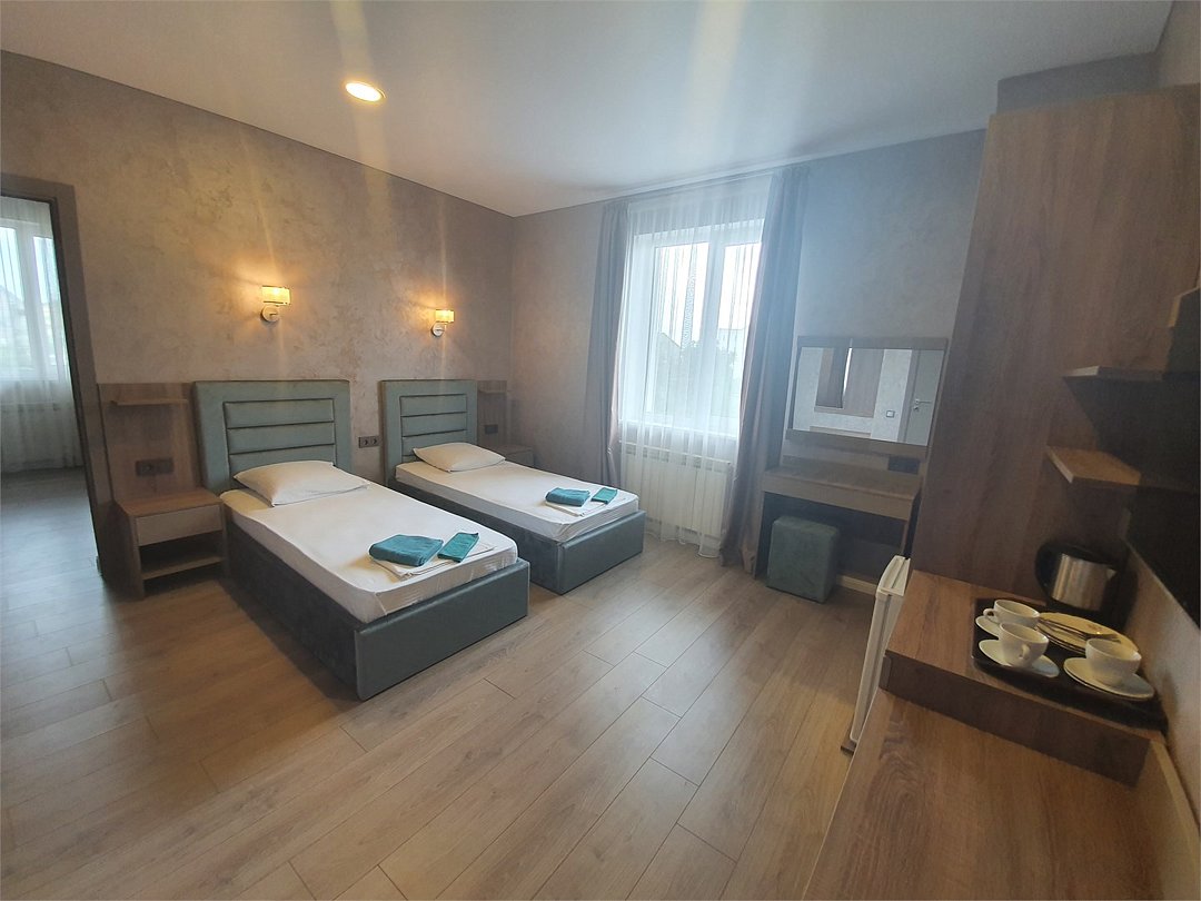 Двухкомнатный номер с балконом и без, средней площадью 30-40 кв.м., санузел совмещенный в номере. Мебель в номере: двуспальная и две односпальные кровати (или 2х спальный диван), прикроватные тумбы, шкаф, туалетный стол, стол столовый с мини кухней, обувница с зеркалом и другая мебель. Техника: кондиционер, холодильник, телевизор (в каждой комнате), чайник, микроволновая печь, фен, стиральная машина. Так же в номере присутствуют: подушки и одеяла, постельное белье, полотенца на каждого человека по 2 шт., посуда, набор косметики для душа и т.д.Услуги и удобства