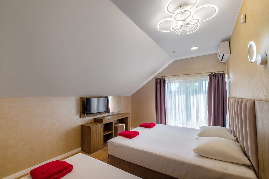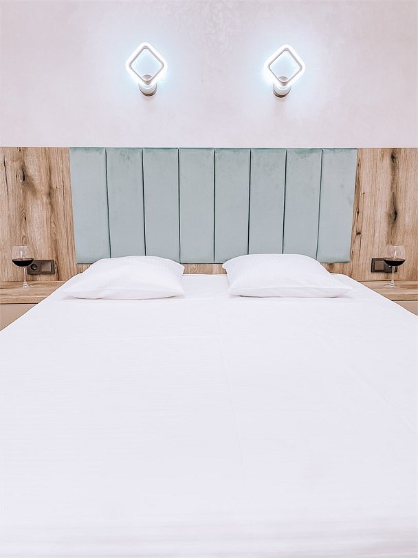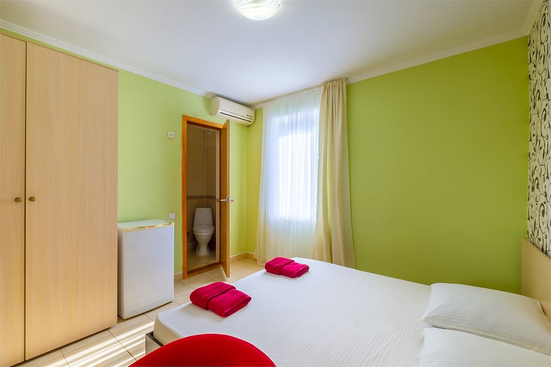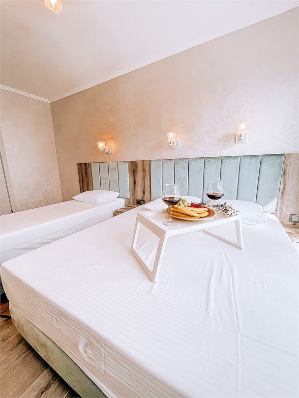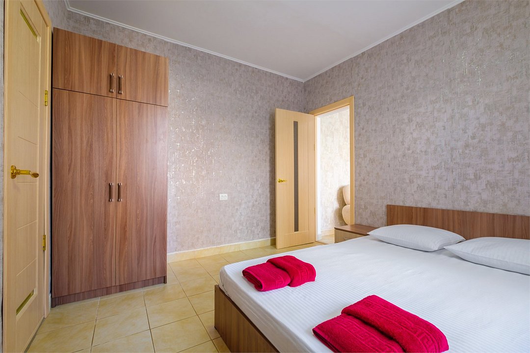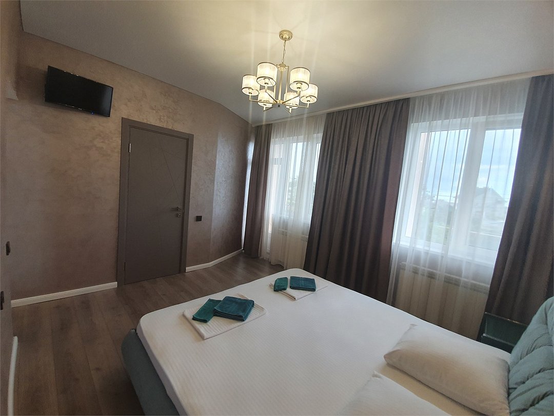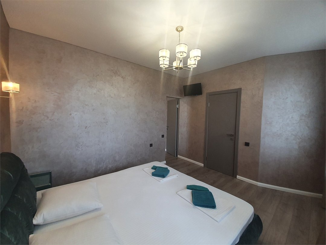 Двухкомнатный номер с балконом и без, средней площадью 30-40 кв.м., санузел совмещенный в номере. Мебель в номере: двуспальная и две односпальные кровати (или 2х спальный диван), прикроватные тумбы, шкаф, туалетный стол, стол столовый с мини кухней, обувница с зеркалом и другая мебель. Техника: кондиционер, холодильник, телевизор (в каждой комнате), чайник, микроволновая печь, фен, стиральная машина. Так же в номере присутствуют: подушки и одеяла, постельное белье, полотенца на каждого человека по 2 шт., посуда, набор косметики для душа и т.д.Услуги и удобства