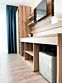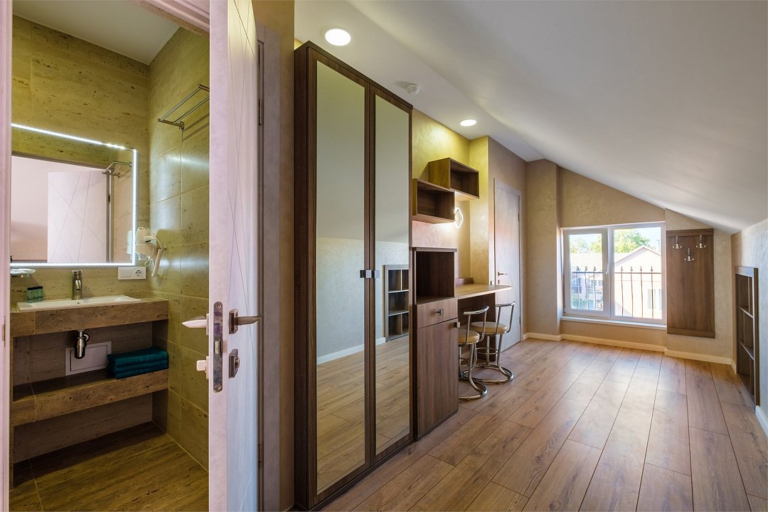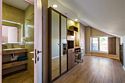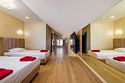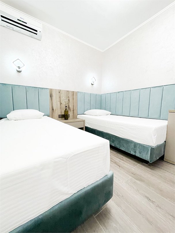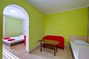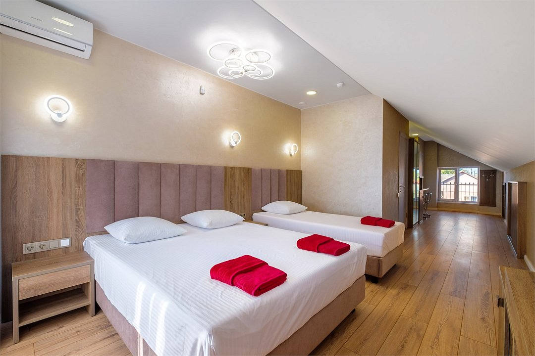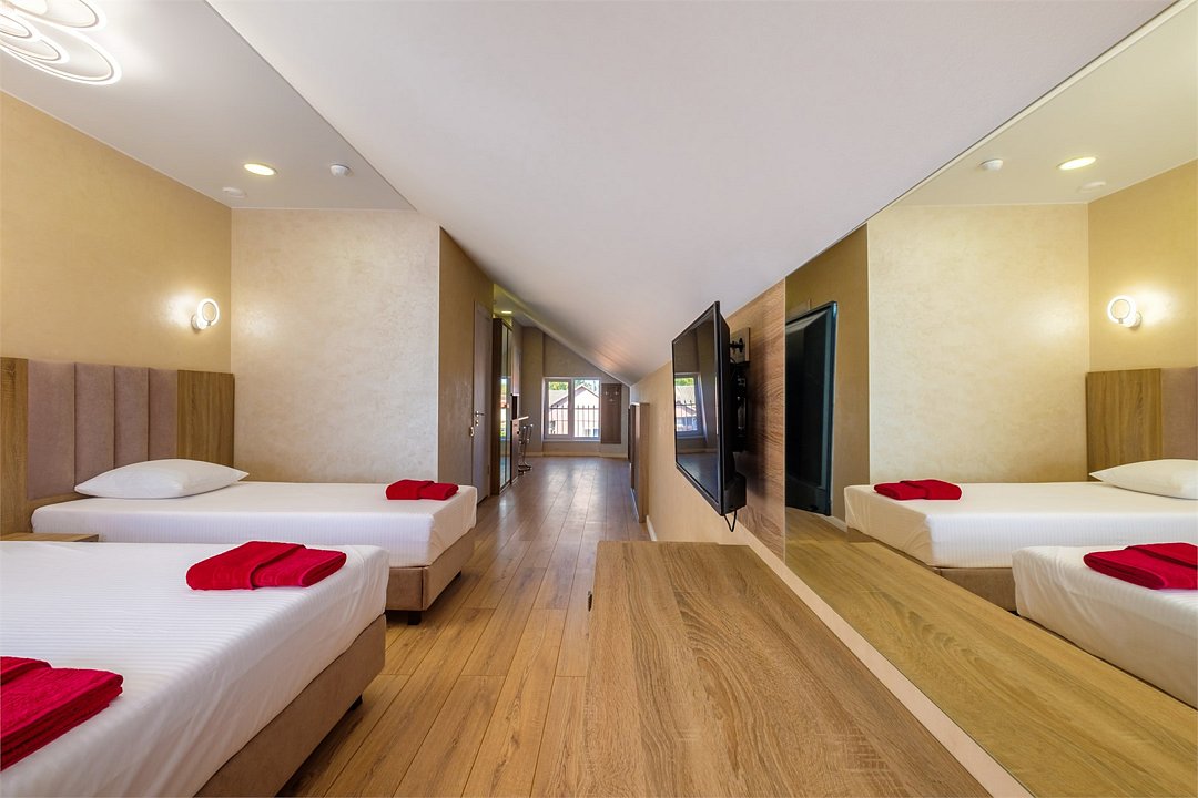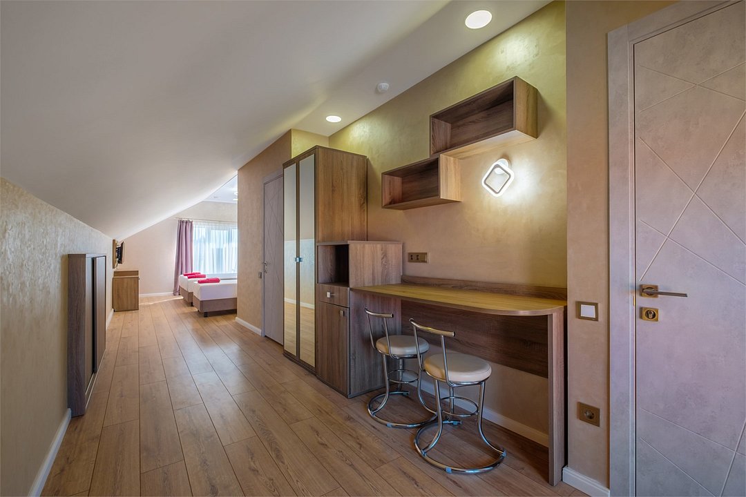 Двухкомнатный номер, средней площадью 30-40 кв.м., санузел раздельный в номере. Мебель в номере: двуспальная и две односпальные кровати, прикроватные тумбы, шкаф, туалетный стол, стол столовый с мини кухней, обувница с зеркалом и другая мебель. Техника: кондиционер, холодильник, телевизор чайник, фен. Так же в номере присутствуют: подушки и одеяла, постельное белье, полотенца на каждого человека по 2 шт., посуда, набор косметики для душа и т.д. Возле номера или на балконе(требует уточнения): столик со стульями, сушка для белья.Услуги и удобства