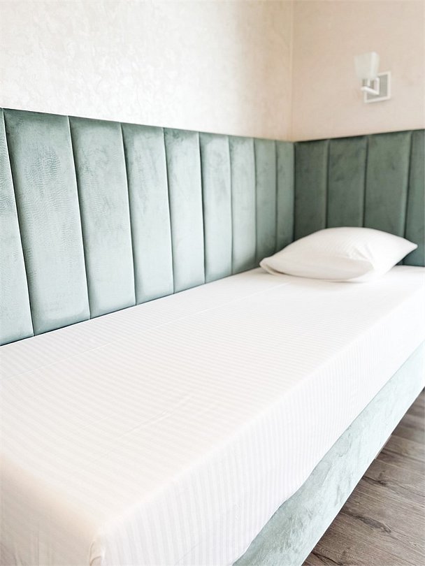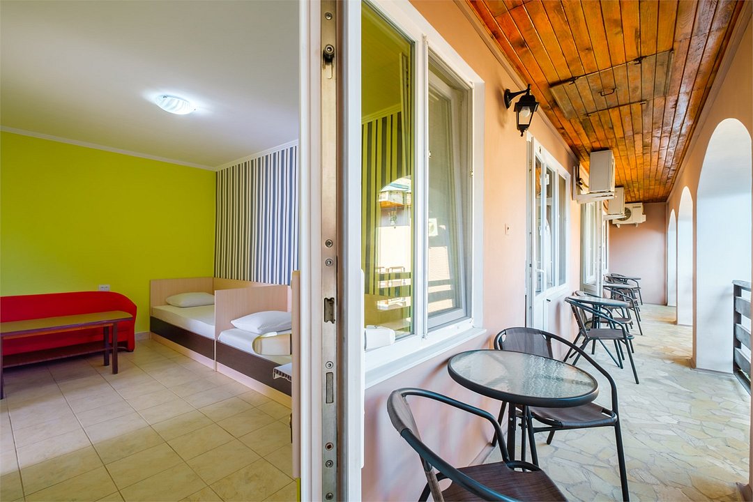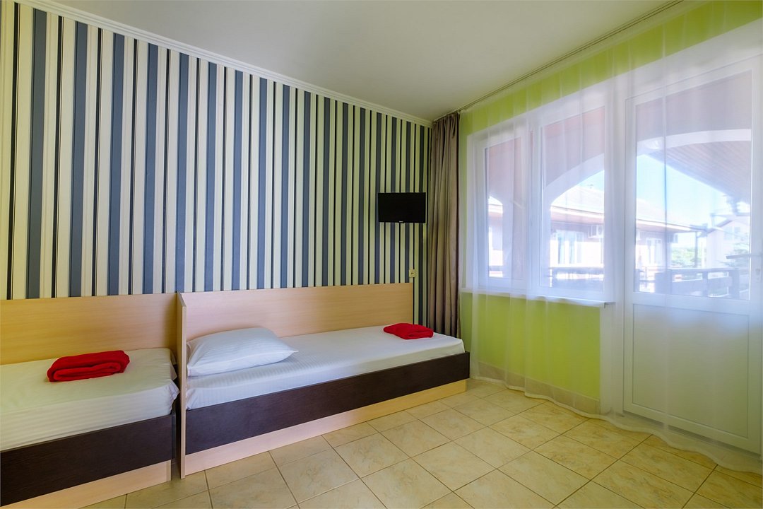 Однокомнатный номер с балконом и без, средней площадью 13-20 кв.м., санузел совмещенный в номере. Мебель в номере: двуспальная и односпальная кровати, прикроватные тумбы, шкаф и другая мебель. Техника: кондиционер, холодильник, телевизор, фен. Так же в номере присутствуют: подушки и одеяла, постельное белье, полотенца на каждого человека по 2 шт., набор косметики для душа. Возле номера или на балконе(требует уточнения): столик со стульями, сушка для белья.Услуги и удобства
