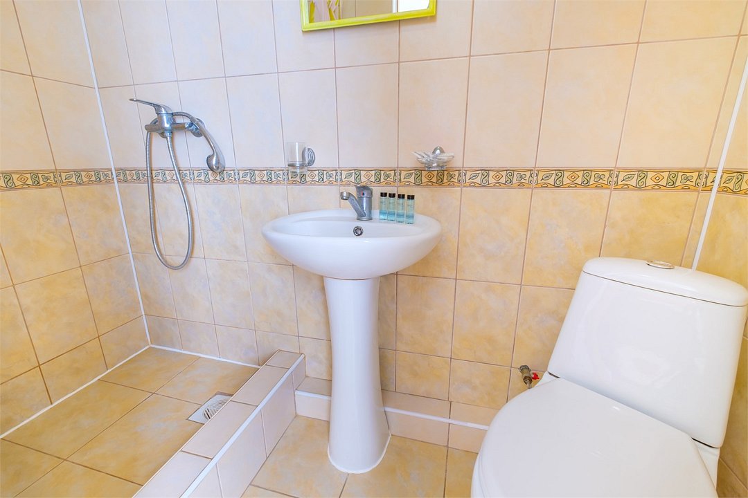 два телевизора, Wi-Fi, холодильник, кондиционер, светильник, фен, санузел, банные полотенца, тапочки, косметические средства, двуспальная кровать, две односпальные кровати, унитаз, раковина, отдельный вход в номер, душ, раздельный санузел, вид во двор, туалетные средства, туалет, гостиничная парфюмерияВ номере