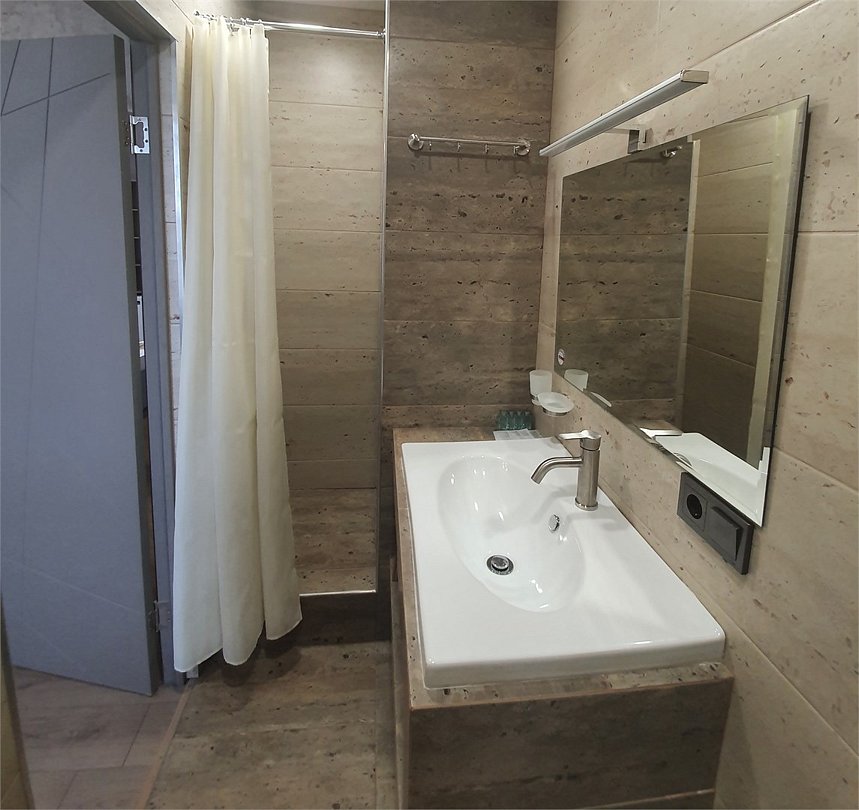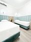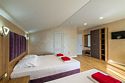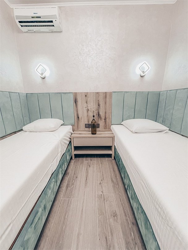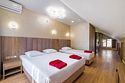 Двухкомнатный номер средней площадью 20-30 кв.м., санузел совмещенный в номере. Мебель в номере: двуспальная и две односпальные кровати (или диван двухспальный, уточняйте), прикроватные тумбы, шкаф, туалетный стол и другая мебель. Техника: кондиционер, холодильник, телевизор, фен. Так же в номере присутствуют: подушки и одеяла, постельное белье, полотенца на каждого человека по 2 шт., набор косметики для душа. Возле номера: столик со стульями, сушка для белья.Услуги и удобства