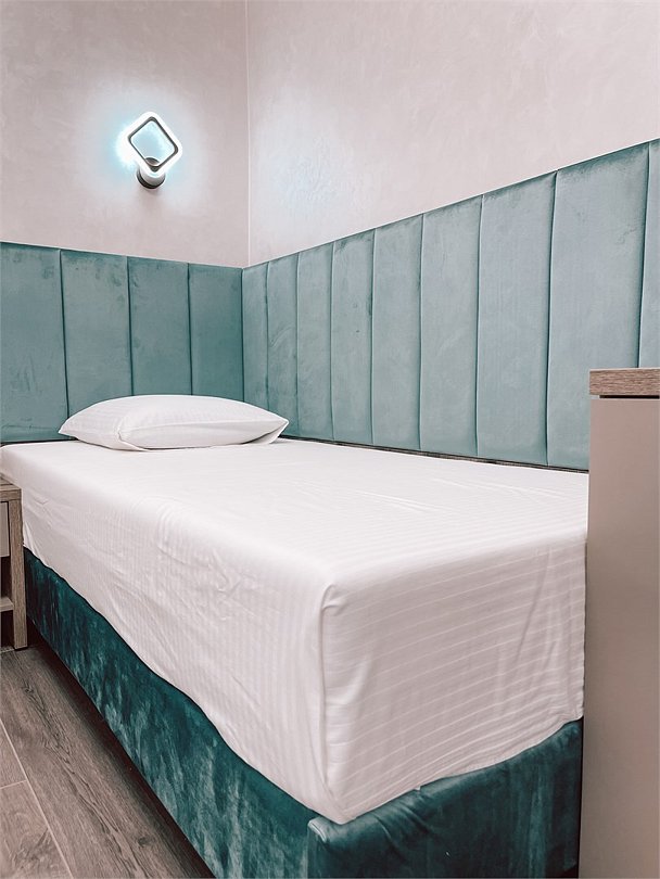 Однокомнатный номер с балконом и без, средней площадью 10-15 кв.м., санузел совмещенный в номере. Мебель в номере: двуспальная кровать или две односпальные, прикроватные тумбы, шкаф и другая мебель. Техника: кондиционер, холодильник, телевизор, фен. Так же в номере присутствуют: подушки и одеяла, постельное белье, полотенца на каждого человека по 2 шт., набор косметики для душа. Возле номера или на балконе(требует уточнения): столик со стульями, сушка для белья.Услуги и удобства