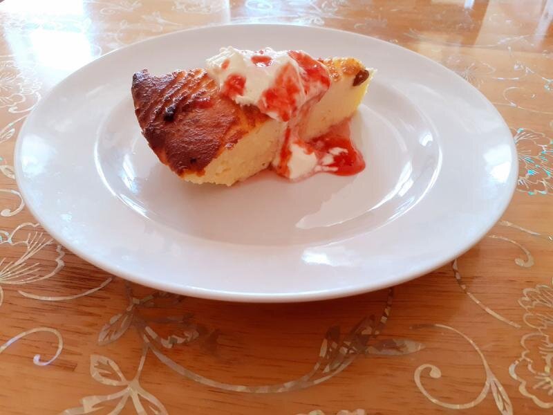 - Сырники, или творожная запеканка: со сметаной (со сгущёнкой, или вареньем) - порция на выбор.
