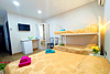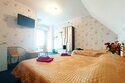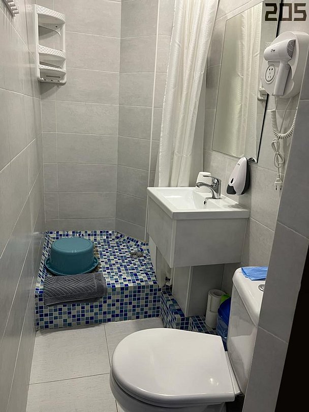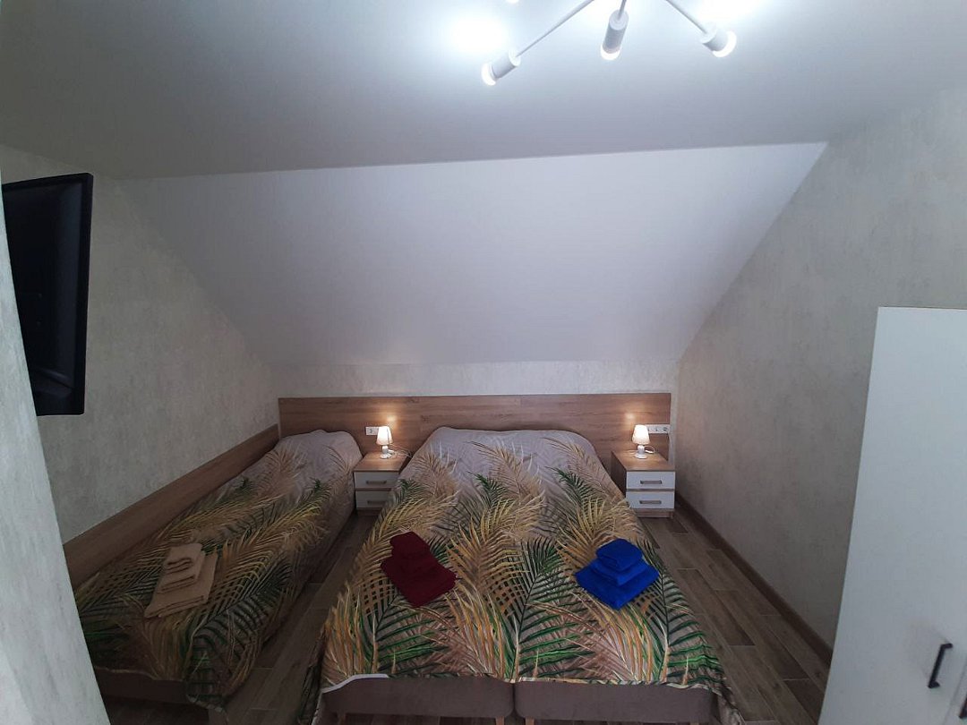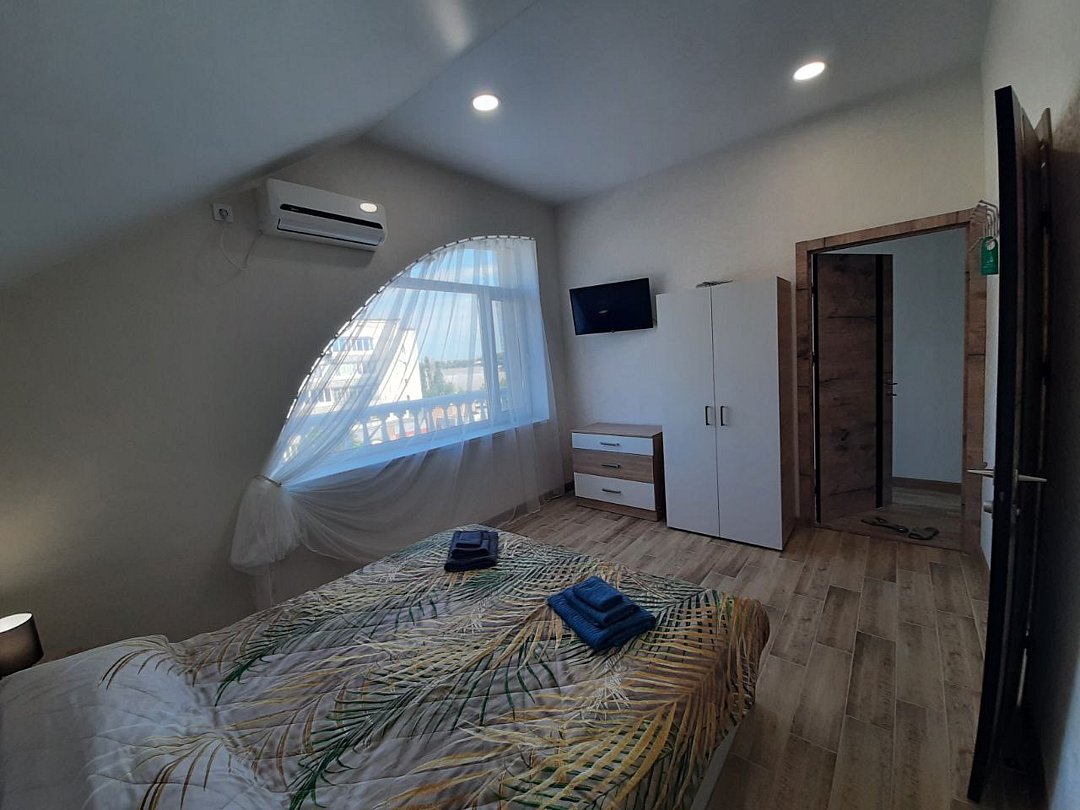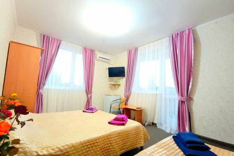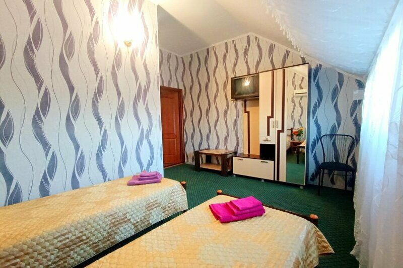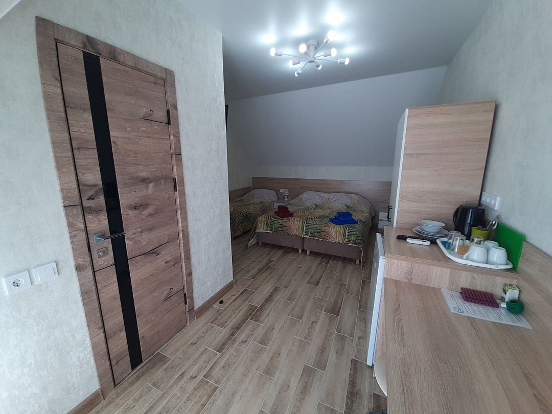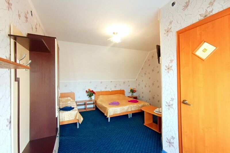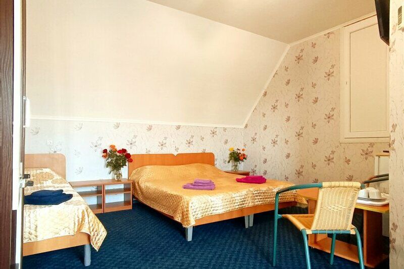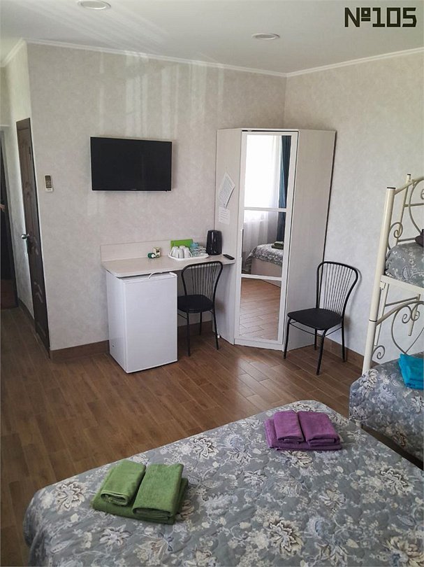 Семейный номер на 4 этаже с 1 односпальной кроватью и 1 двуспальной кроватью, подходит для 1-3 человек, оборудован всем необходимым для комфортного проживания. В номере предусмотрены: шкаф для одежды, зеркало, кондиционер, телевизор, Wi-Fi, холодильник, чайник, полотенца, санузел. На этаже расположены: гладильная доска и утюг, микроволновая печь, кулер с водой (в летнее время). Предоставляется стирка за дополнительную плату. На территории гостевого дома имеется общая парковка с ограниченным числом парковочных мест. Бронирование мест не предусмотрено и невозможно.Услуги и удобства
