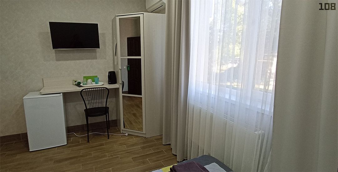 телевизор, Wi-Fi, холодильник, кондиционер, фен, душевая кабина, санузел, банные полотенца, двуспальная кровать, тумбы, стулья, шкаф для одежды, вешалки, зеркало, набор посуды, чайник, унитаз, раковина, вид на город, кулер на этаже, плиточное покрытие, вид во двор, стаканы, столовые приборы, стол, туалетные средства, москитная сетка, номер для некурящих, двухъярусная кровать, фумигатор, уборка номера, услуги прачечной (платно), затемняющая штора, зеркало в полный ростВ гостиничном номере