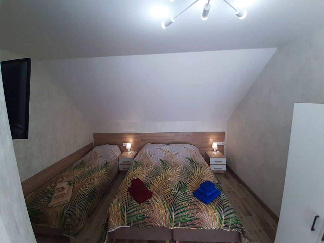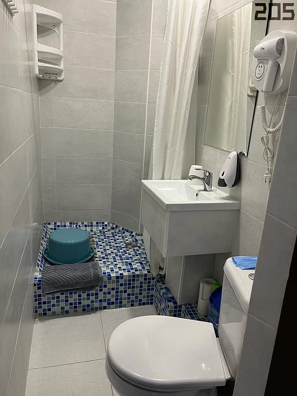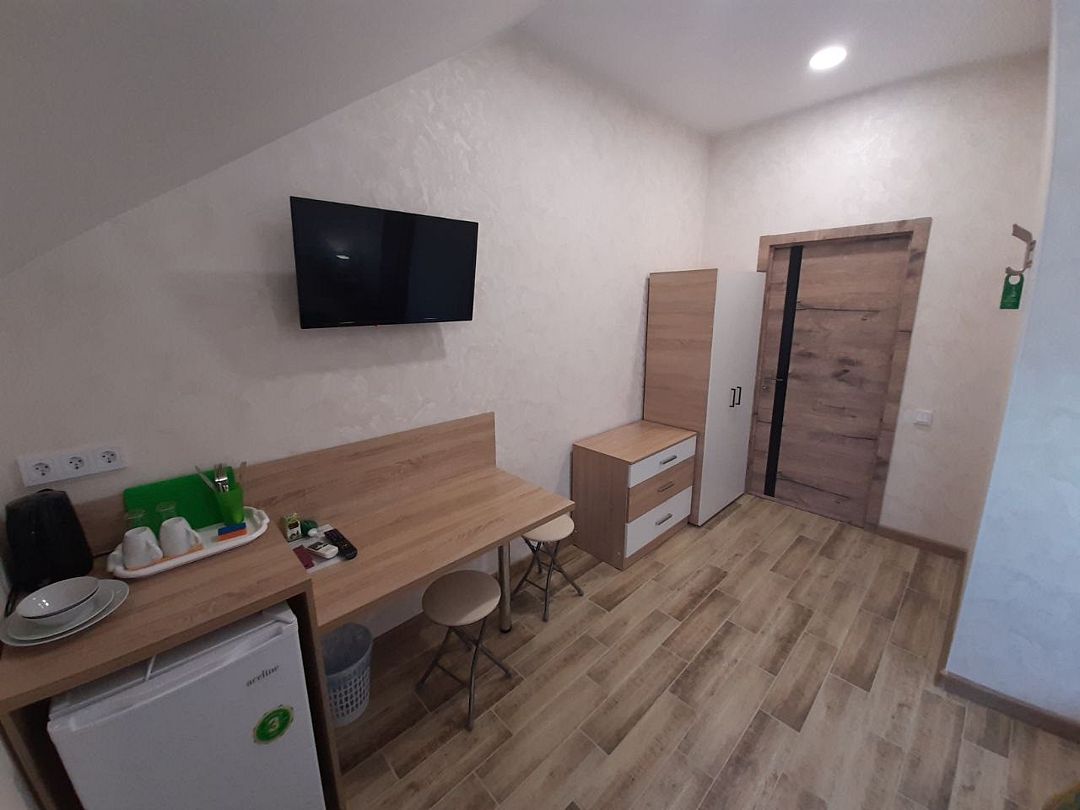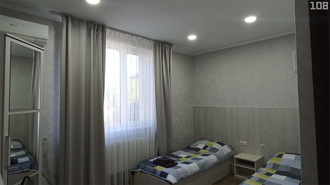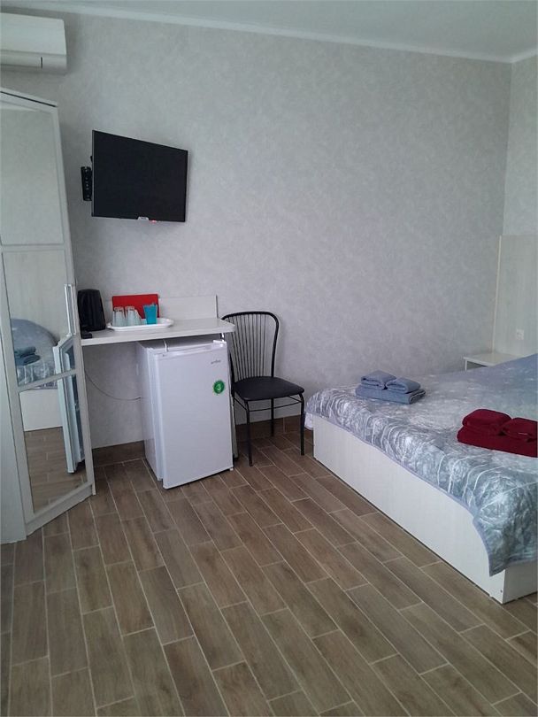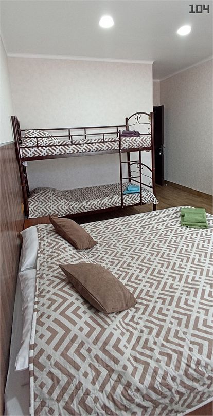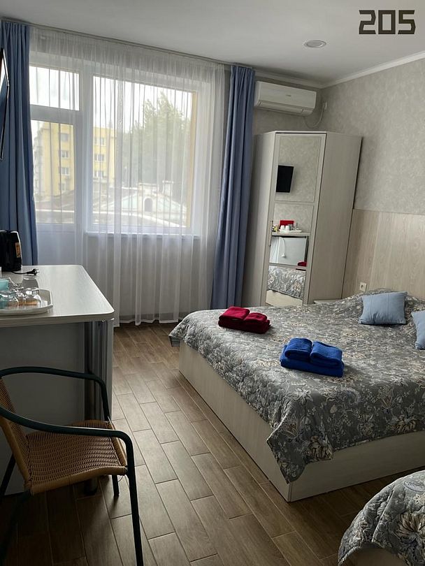 Семейный номер на 4 этаже с 1 односпальной кроватью и 1 двуспальной кроватью, подходит для 1-3 человек, оборудован всем необходимым для комфортного проживания. В номере предусмотрены: шкаф для одежды, зеркало, кондиционер, телевизор, Wi-Fi, холодильник, чайник, полотенца, санузел. На этаже расположены: гладильная доска и утюг, микроволновая печь, кулер с водой (в летнее время). Предоставляется стирка за дополнительную плату. На территории гостиницы имеется общая парковка с ограниченным числом парковочных мест. Бронирование мест не предусмотрено и невозможно.Услуги и удобства