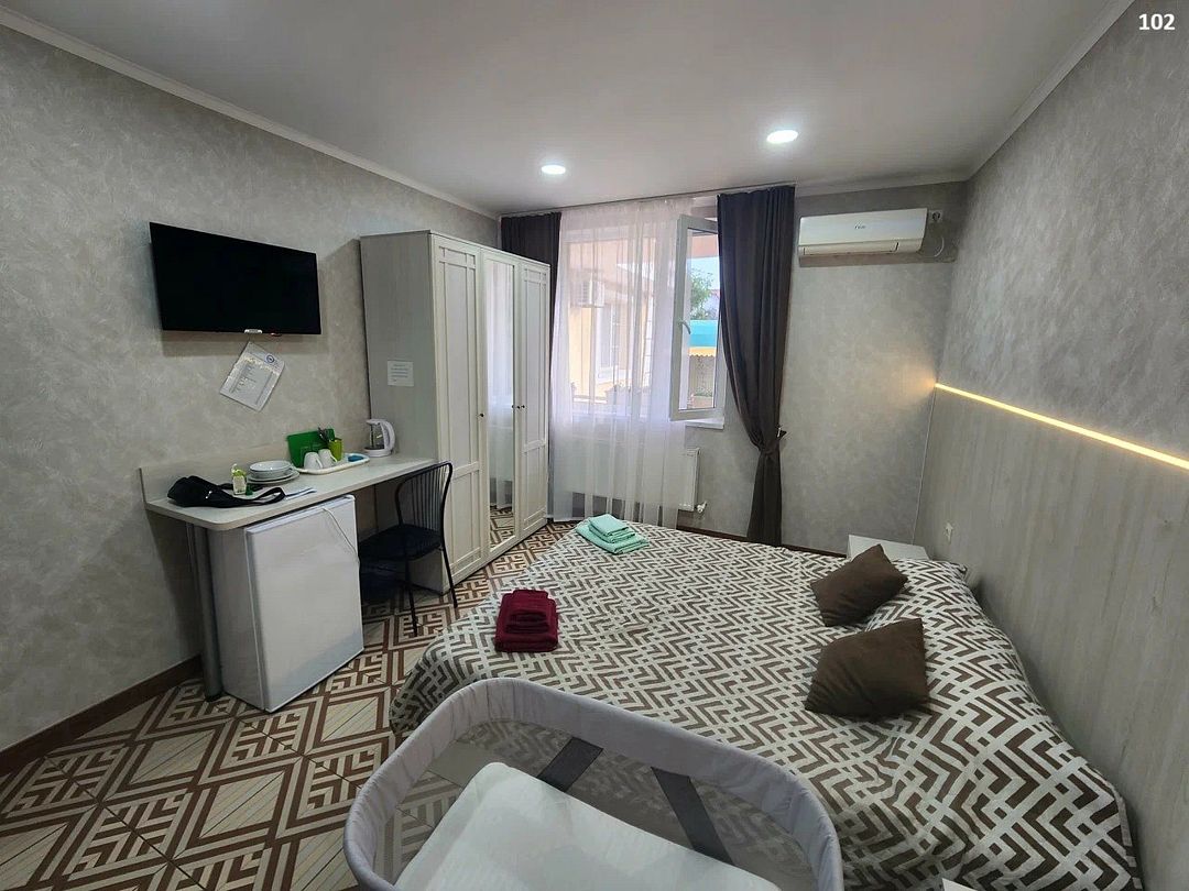 Семейный номер с двуспальной кроватью, оборудован всем необходимым для комфортного проживания. Возможно размещение ребенка в возрасте 0-4 лет включительно на кровати без предоставления спального места. В номере предусмотрены: шкаф для одежды, зеркало, кондиционер, телевизор, Wi-Fi, холодильник, чайник, полотенца, санузел. Полотенца и гигиенические принадлежности предоставляются. На этаже расположены: гладильная доска и утюг, микроволновая печь, кулер с водой (в летнее время). Предоставляется стирка за дополнительную плату. На территории гостиницы имеется общая парковка с ограниченным числом парковочных мест. Бронирование мест не предусмотрено и невозможно.Услуги и удобства