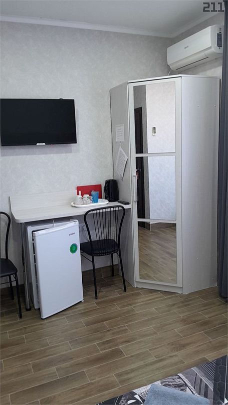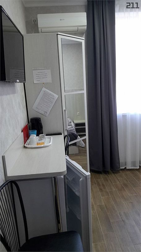 телевизор, Wi-Fi, холодильник, кондиционер, фен, душевая кабина, санузел, банные полотенца, двуспальная кровать, тумбы, стулья, шкаф для одежды, вешалки, зеркало, набор посуды, чайник, унитаз, раковина, вид на город, кулер на этаже, плиточное покрытие, вид во двор, стаканы, столовые приборы, стол, туалетные средства, москитная сетка, номер для некурящих, фумигатор, уборка номера, услуги прачечной (платно), затемняющая штора, зеркало в полный ростВ гостиничном номере