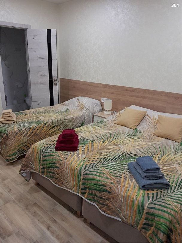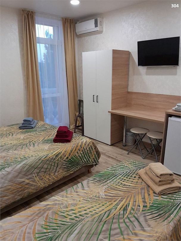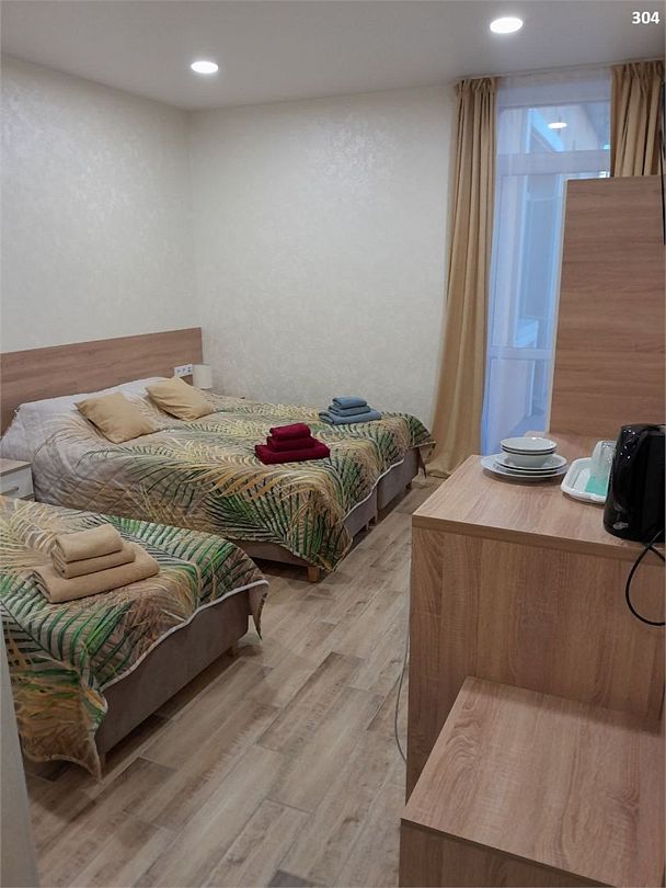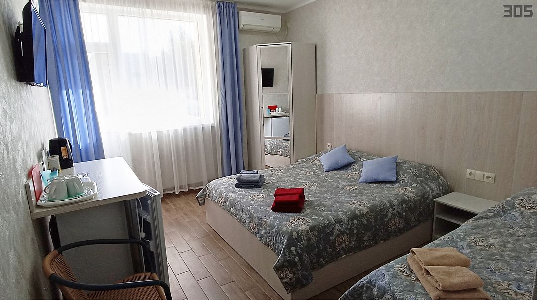 Семейный номер с 1 односпальной кроватью и 1 двуспальной кроватью, оборудован всем необходимым для комфортного проживания. Возможно размещение одного ребенка в возрасте от 0-4 лет без предоставления места. В номере предусмотрены: шкаф для одежды, зеркало, кондиционер, телевизор, Wi-Fi, холодильник, чайник, полотенца, санузел. 304-305 и 306-307 — смежные номера (между ними есть дверь). На этаже расположены: гладильная доска и утюг, микроволновая печь, кулер с водой (в летнее время). Предоставляется стирка за дополнительную плату. На территории гостиницы имеется общая парковка с ограниченным числом парковочных мест. Бронирование мест не предусмотрено и невозможно.Услуги и удобства