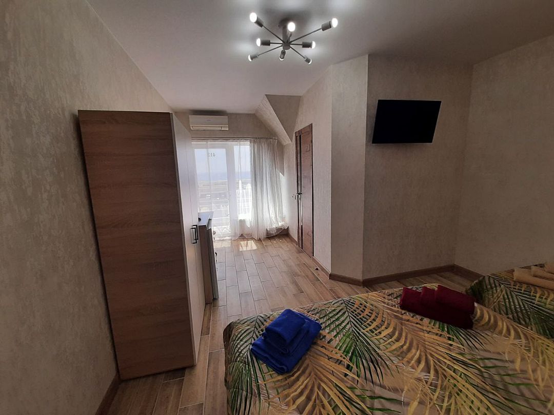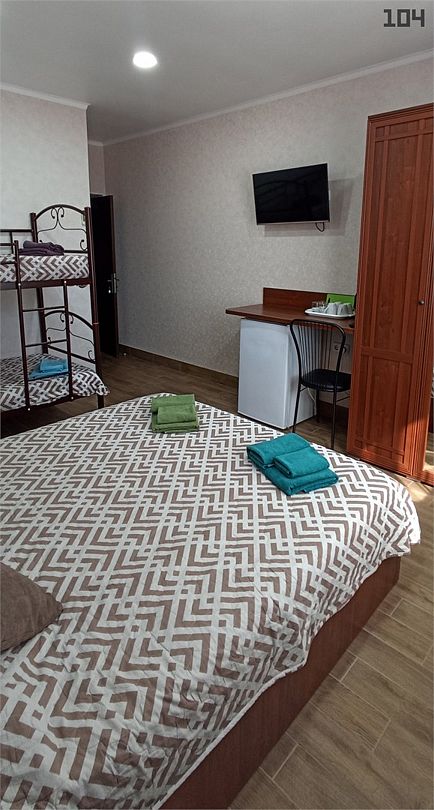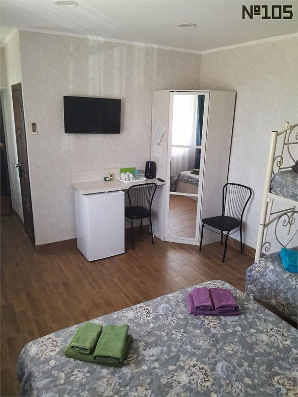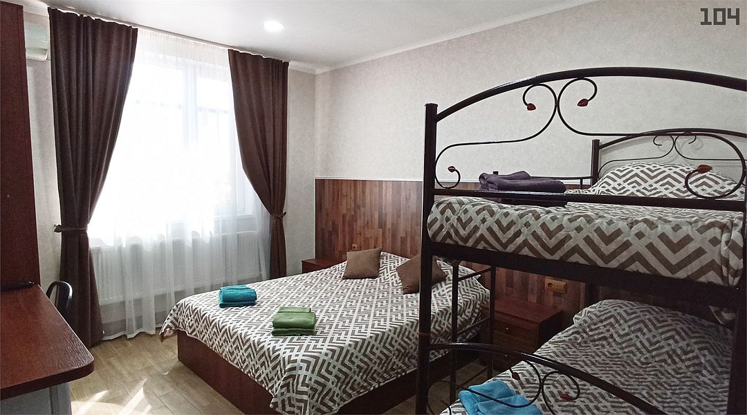 Семейный номер с 1 двуспальной и 1 двухъярусной кроватью. Прекрасно подходит для размещения 1-4 человек, оборудован всем необходимым для комфортного проживания. В номере предусмотрены: шкаф для одежды, зеркало, кондиционер, телевизор, Wi-Fi, холодильник, чайник, полотенца, санузел. ЗАБРОНИРОВАТЬ НОМЕР С БАЛКОНОМ МОЖНО ТОЛЬКО ПО ТЕЛЕФОНУ, ПРИ НАЛИЧИИ СВОБОДНЫХ! На этаже расположены: гладильная доска и утюг, микроволновая печь, кулер с водой (в летнее время). Предоставляется стирка за дополнительную плату. На территории гостиницы имеется общая парковка с ограниченным числом парковочных мест. Бронирование мест не предусмотрено и невозможно.Услуги и удобства