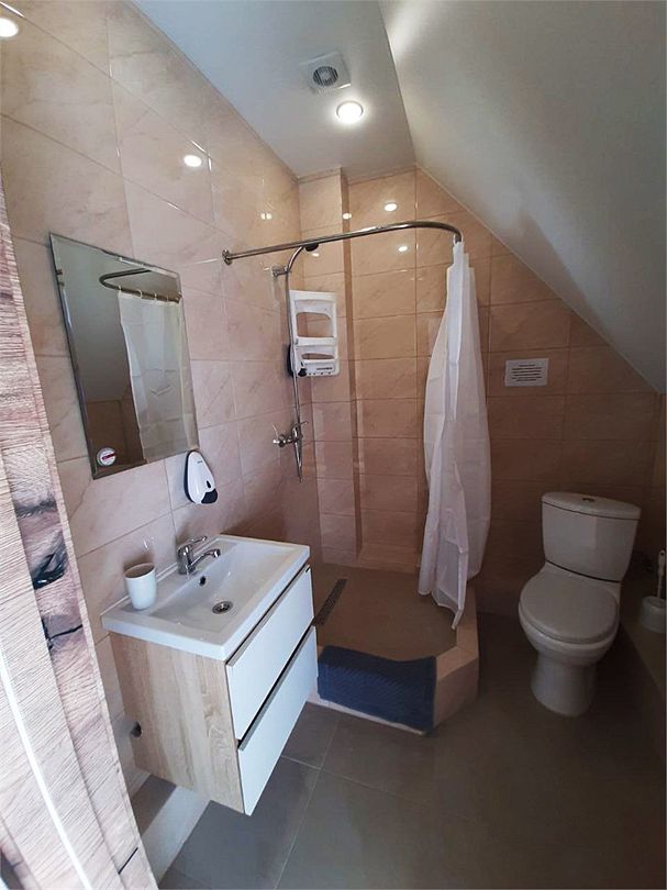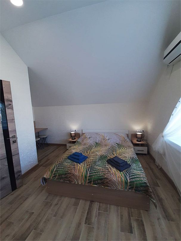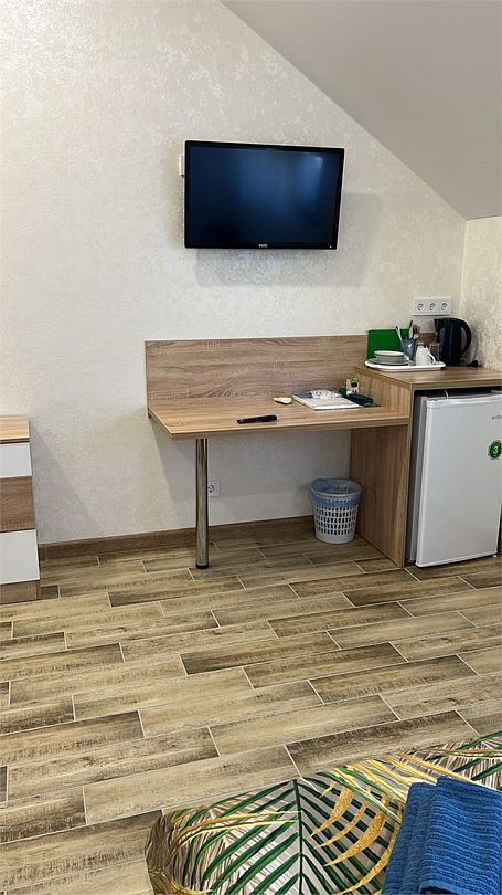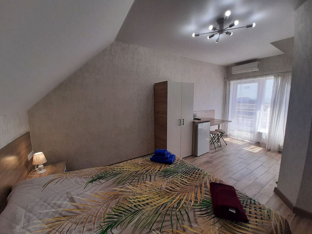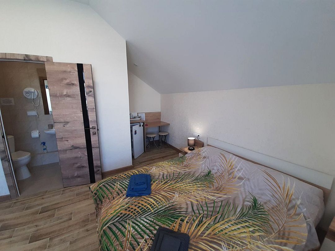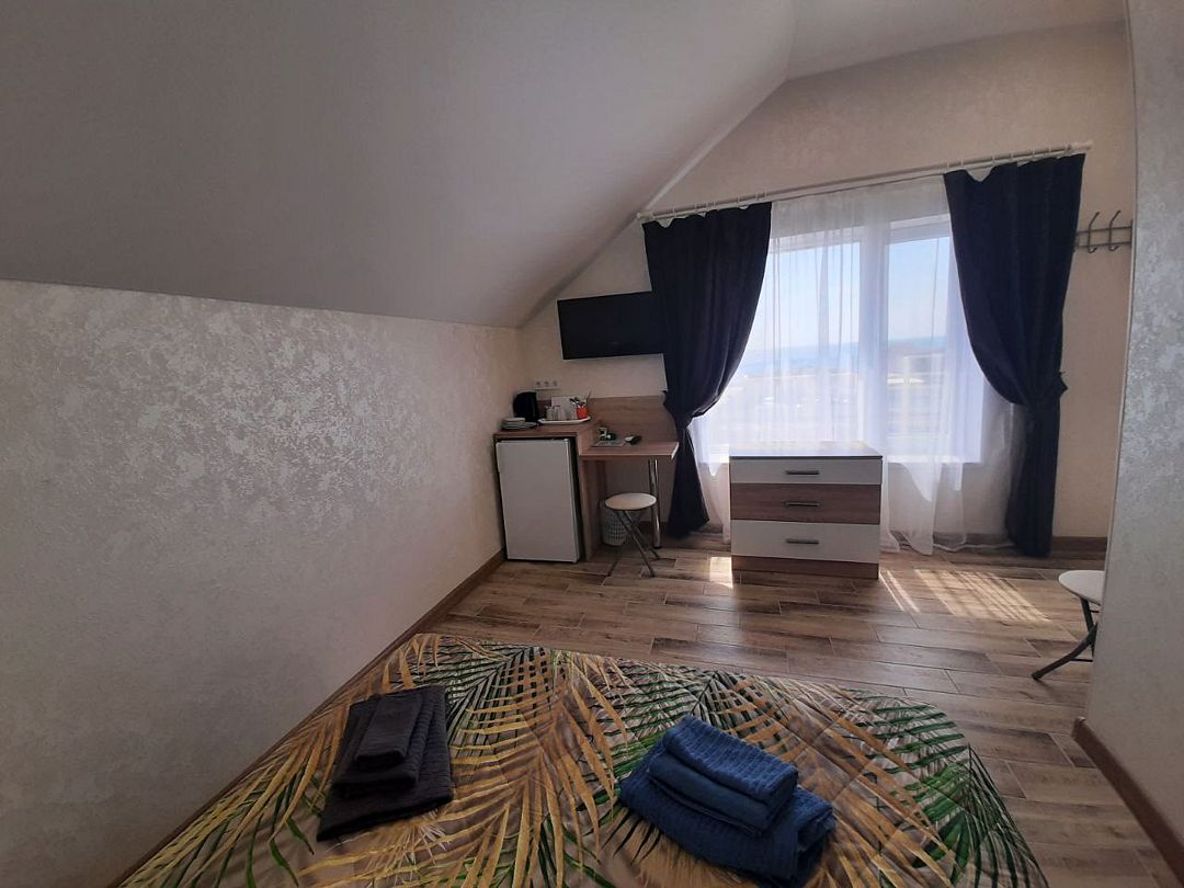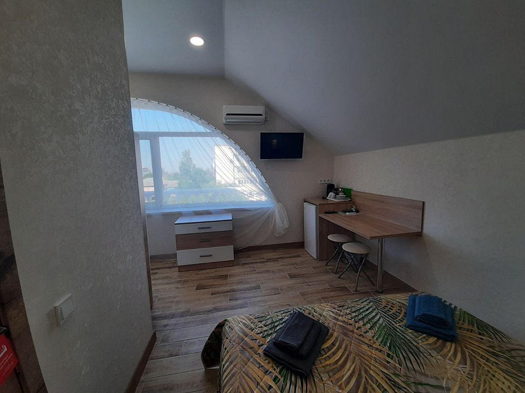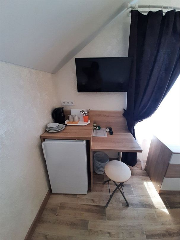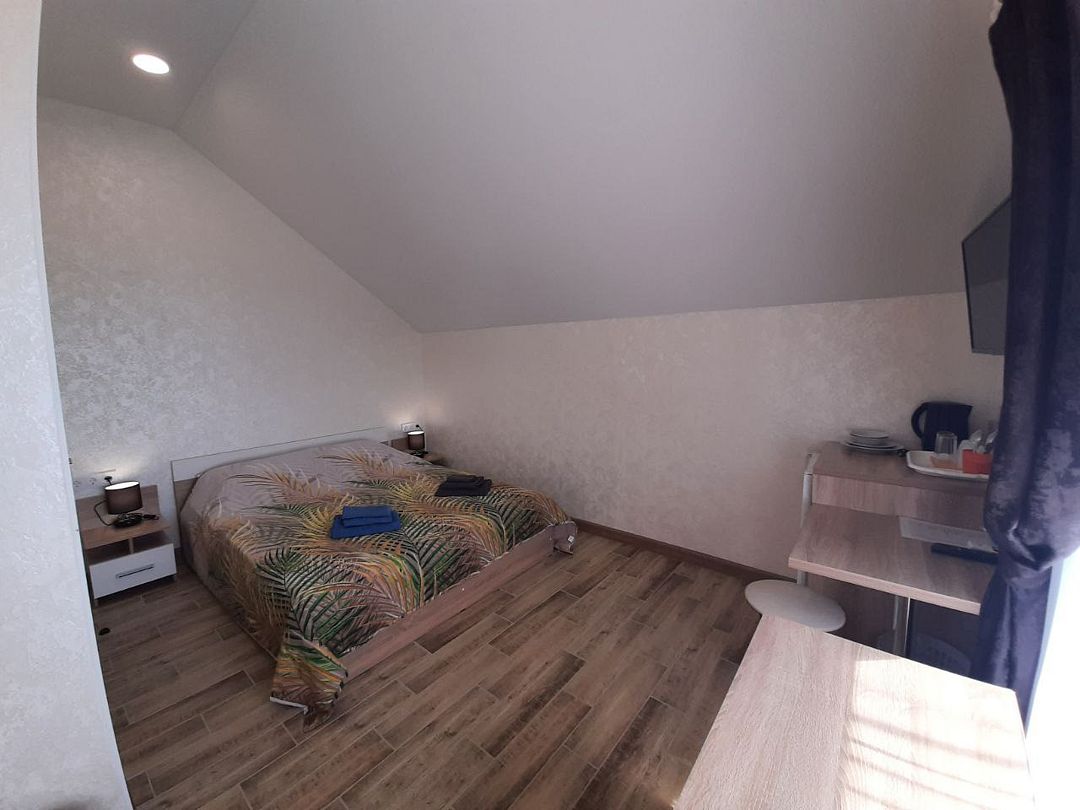 телевизор, Wi-Fi, холодильник, кондиционер, фен, душевая кабина, санузел, двуспальная кровать, тумбы, стулья, вешалки, набор посуды, чайник, унитаз, раковина, кулер на этаже, плиточное покрытие, стаканы, столовые приборы, стол, туалетные средства, москитная сетка, шкаф-купе, мансардные окна, номер для некурящих, фумигатор, уборка номера, услуги прачечной (платно)В гостиничном номере