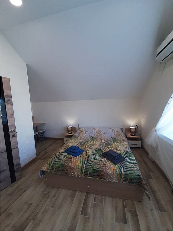 телевизор, Wi-Fi, холодильник, кондиционер, фен, душевая кабина, санузел, двуспальная кровать, тумбы, стулья, вешалки, набор посуды, чайник, унитаз, раковина, кулер на этаже, плиточное покрытие, стаканы, столовые приборы, стол, туалетные средства, москитная сетка, шкаф-купе, мансардные окна, номер для некурящих, фумигатор, уборка номера, услуги прачечной (платно)В номере