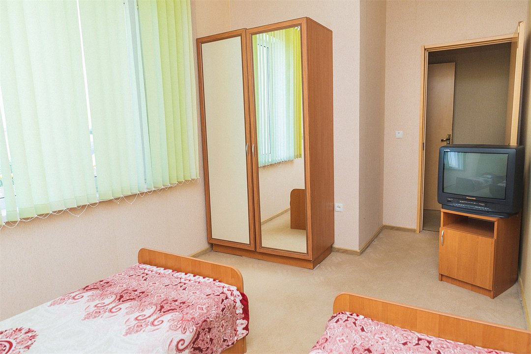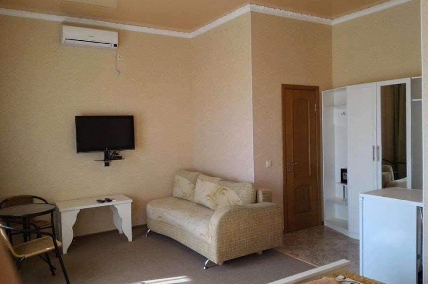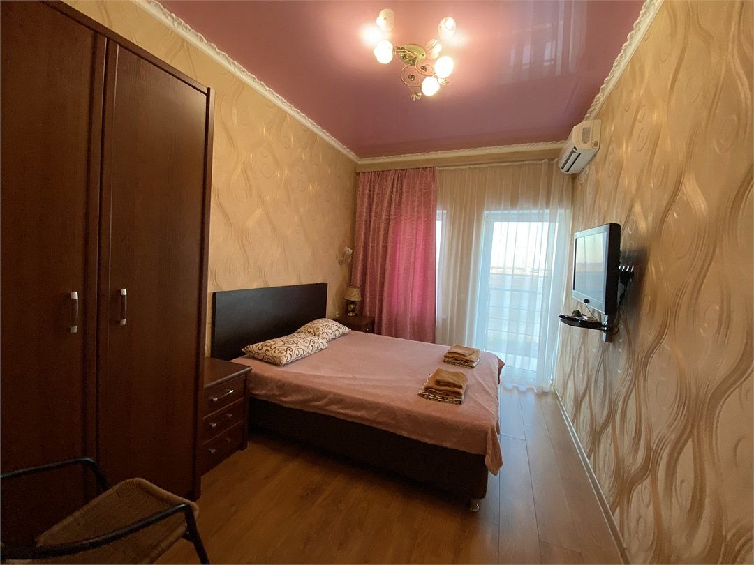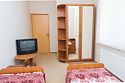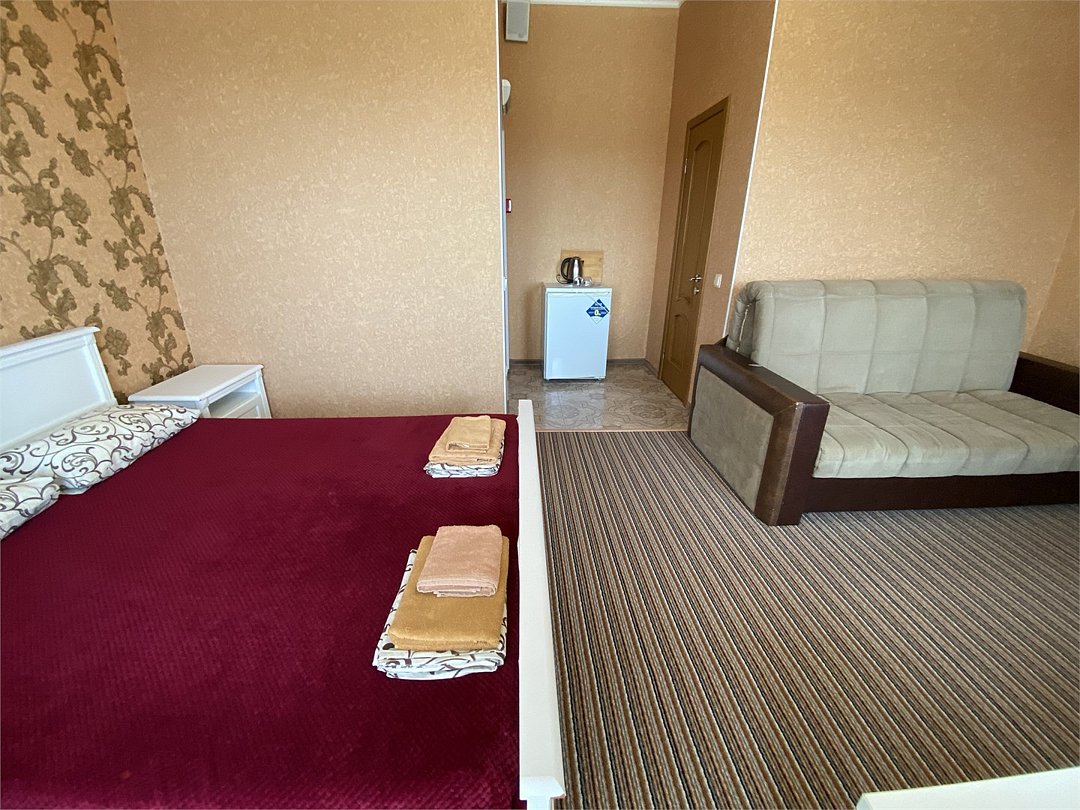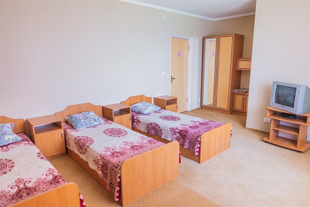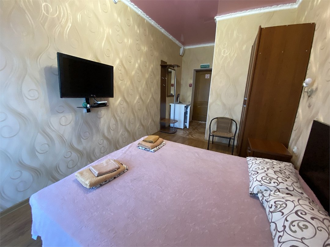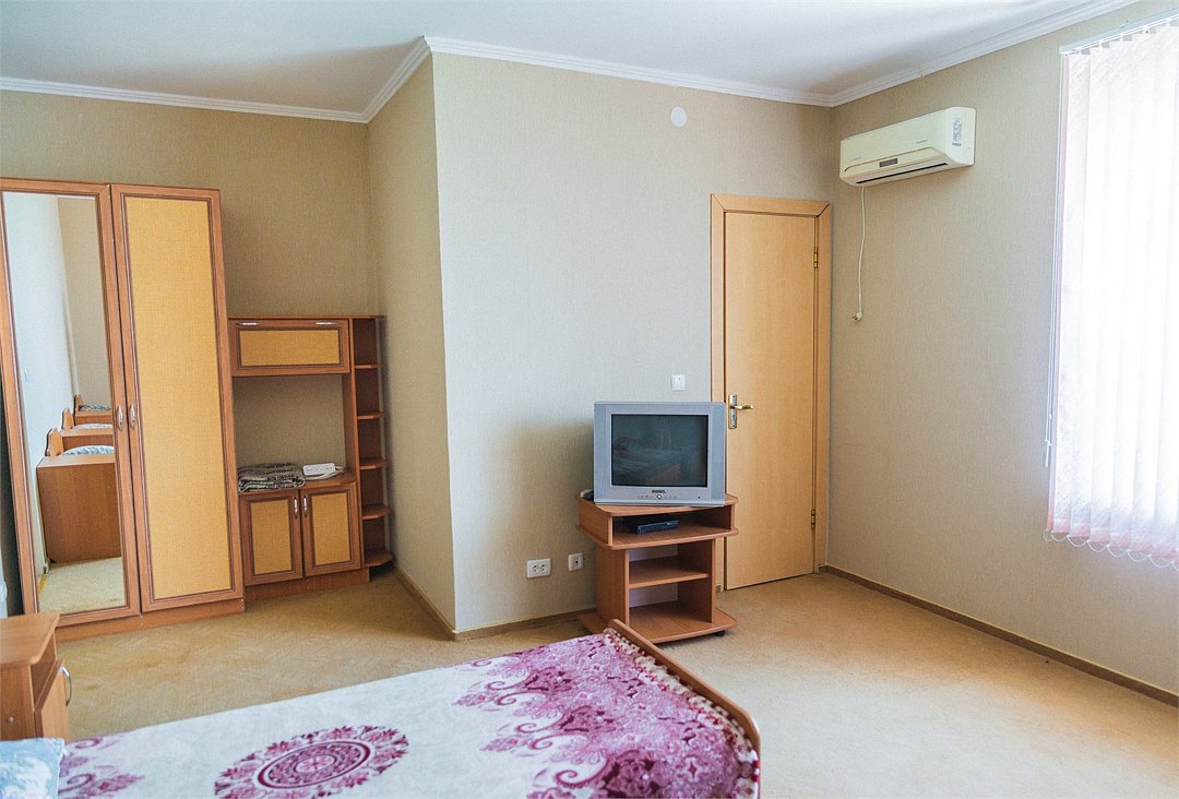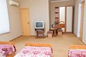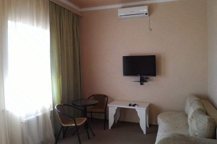 три односпальные кровати; шкаф для одежды; зеркало во весь рост; санузел; кондиционер; телевизор; спутниковое ТВ; общий холодильник на этаже для 3х номеров половое покрытие ковролин ; уборка номера через день по требованию; смена белья через 5 дней; выдается комплект полотенец; выдается два полотенце для пляжа выдается одно покрывало для пляжа бесплатная автостоянка; москитные сетки на окнах; Бесплатная охраняемая автостоянка; Бесплатное пользование WI-FI; Бассейн с морской водой с подогревом.Услуги и удобства