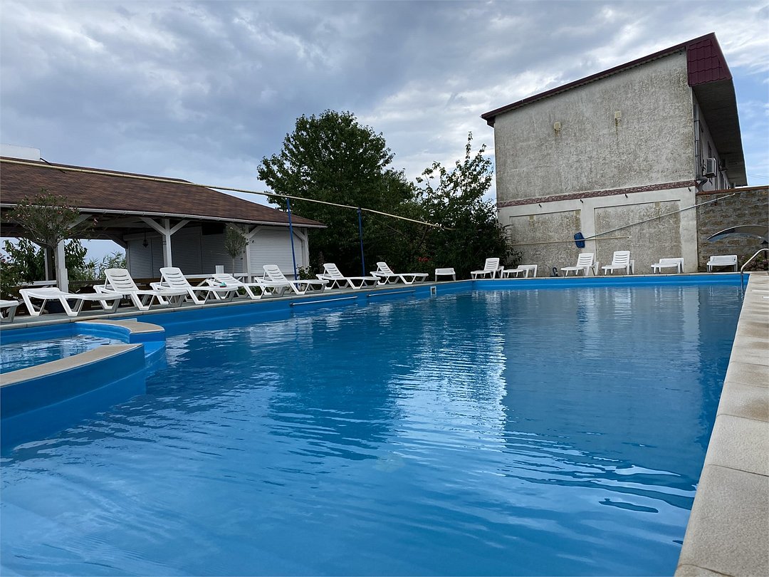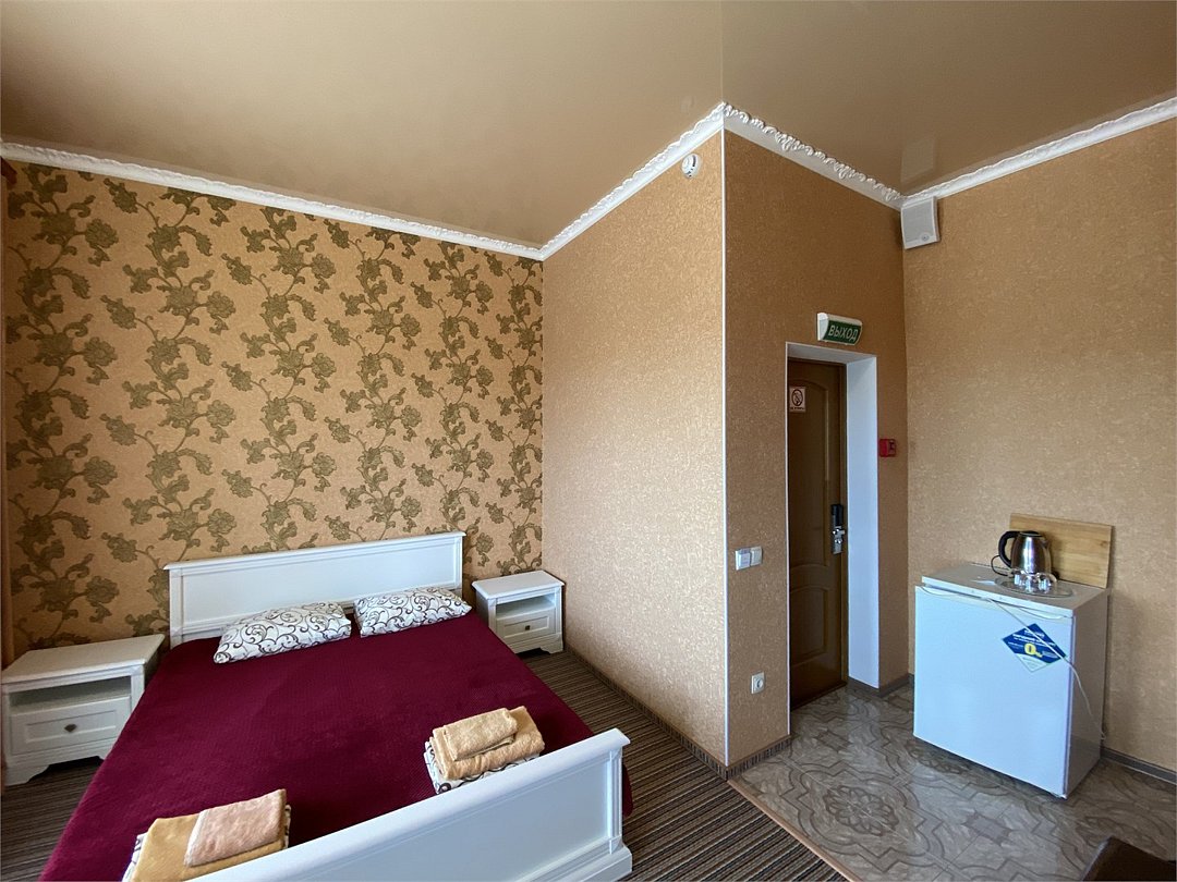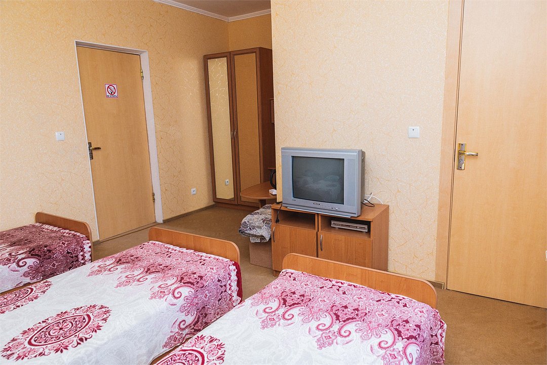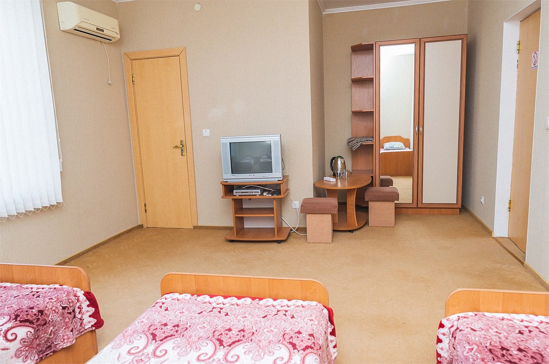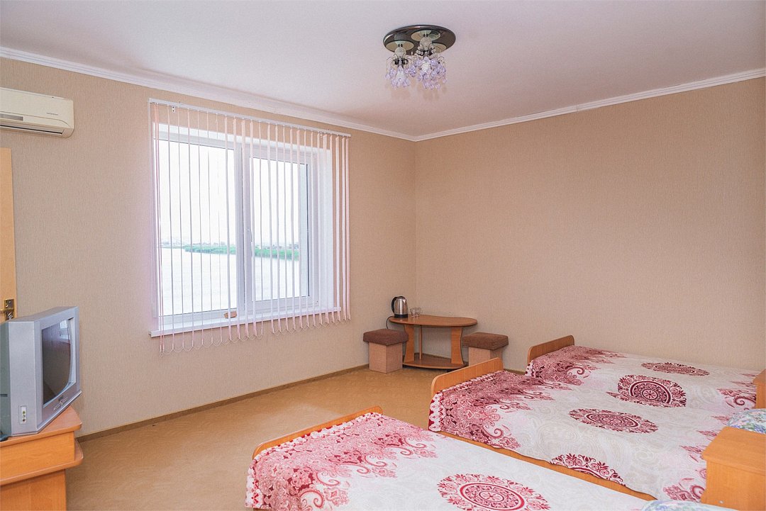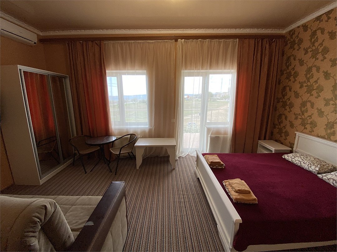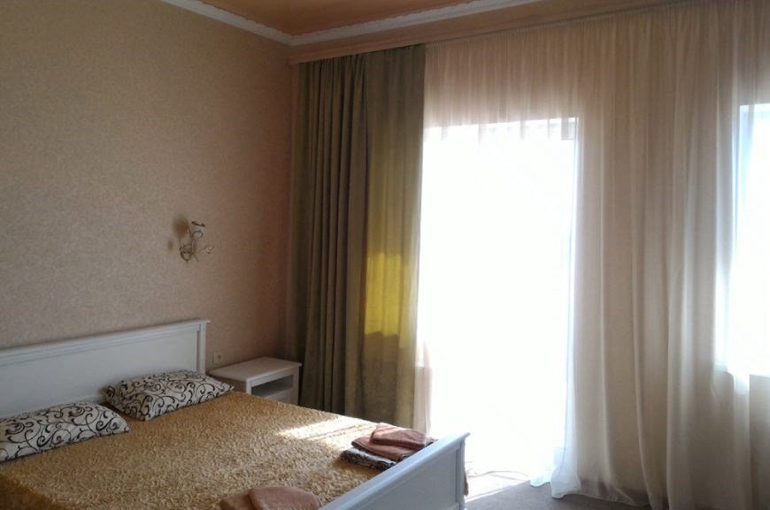 три односпальные кровати; шкаф для одежды; зеркало во весь рост; санузел; кондиционер; телевизор; спутниковое ТВ; общий холодильник на этаже для 3х номеров половое покрытие ковролин ; уборка номера через день по требованию; смена белья через 5 дней; выдается комплект полотенец; выдается два полотенце для пляжа выдается одно покрывало для пляжа бесплатная автостоянка; москитные сетки на окнах; Бесплатная охраняемая автостоянка; Бесплатное пользование WI-FI; Бассейн с морской водой с подогревом.Услуги и удобства