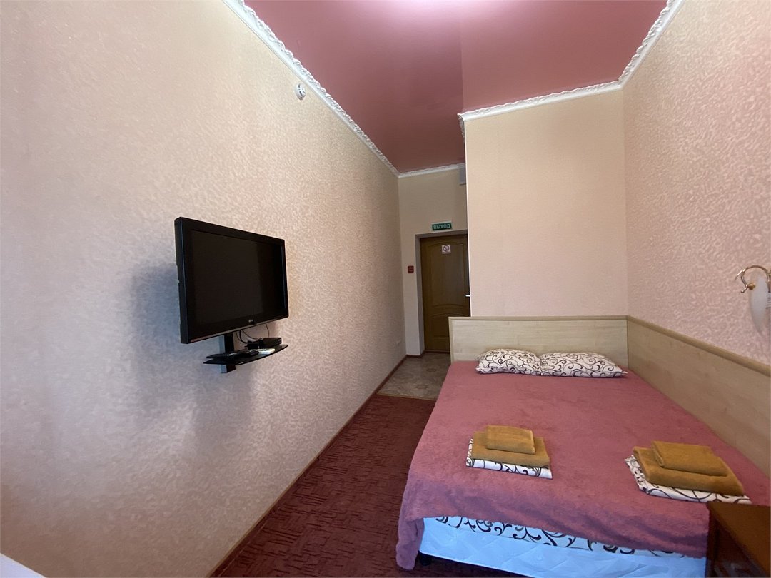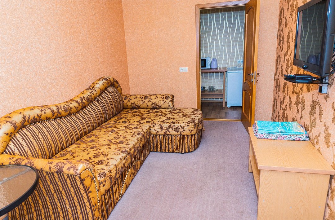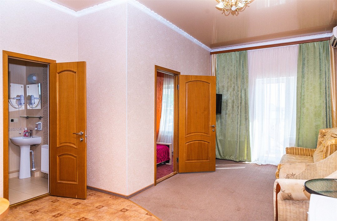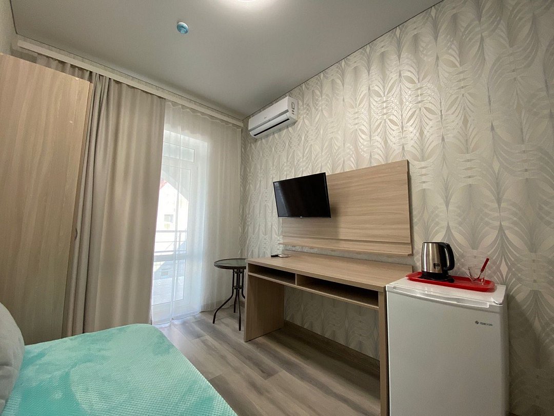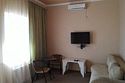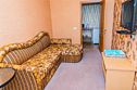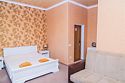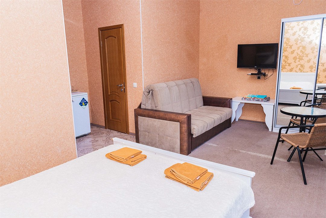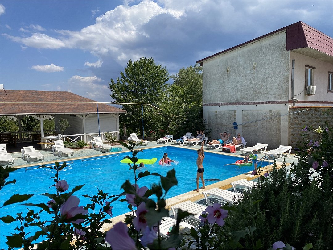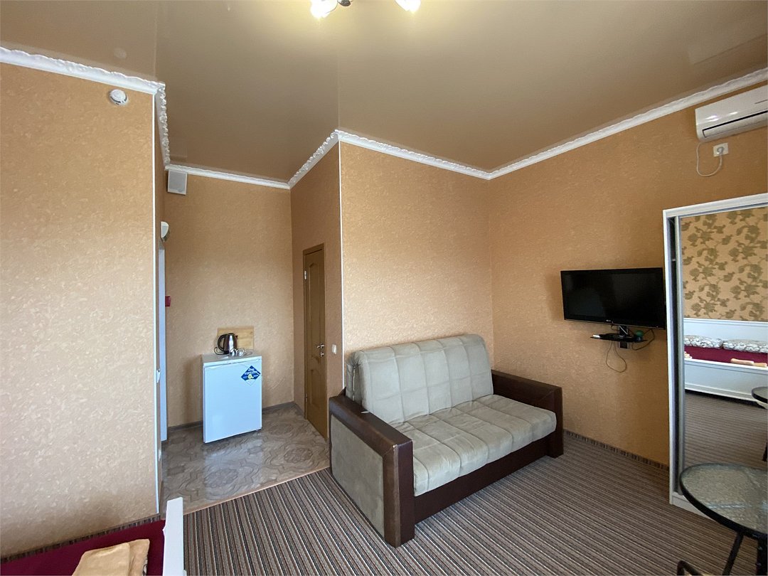 три односпальные кровати; шкаф для одежды; зеркало во весь рост; санузел; кондиционер; телевизор; спутниковое ТВ; общий холодильник на этаже для 3х номеров половое покрытие ковролин ; уборка номера через день по требованию; смена белья через 5 дней; выдается комплект полотенец; выдается два полотенце для пляжа выдается одно покрывало для пляжа бесплатная автостоянка; москитные сетки на окнах; Бесплатная охраняемая автостоянка; Бесплатное пользование WI-FI; Бассейн с морской водой с подогревом.Услуги и удобства