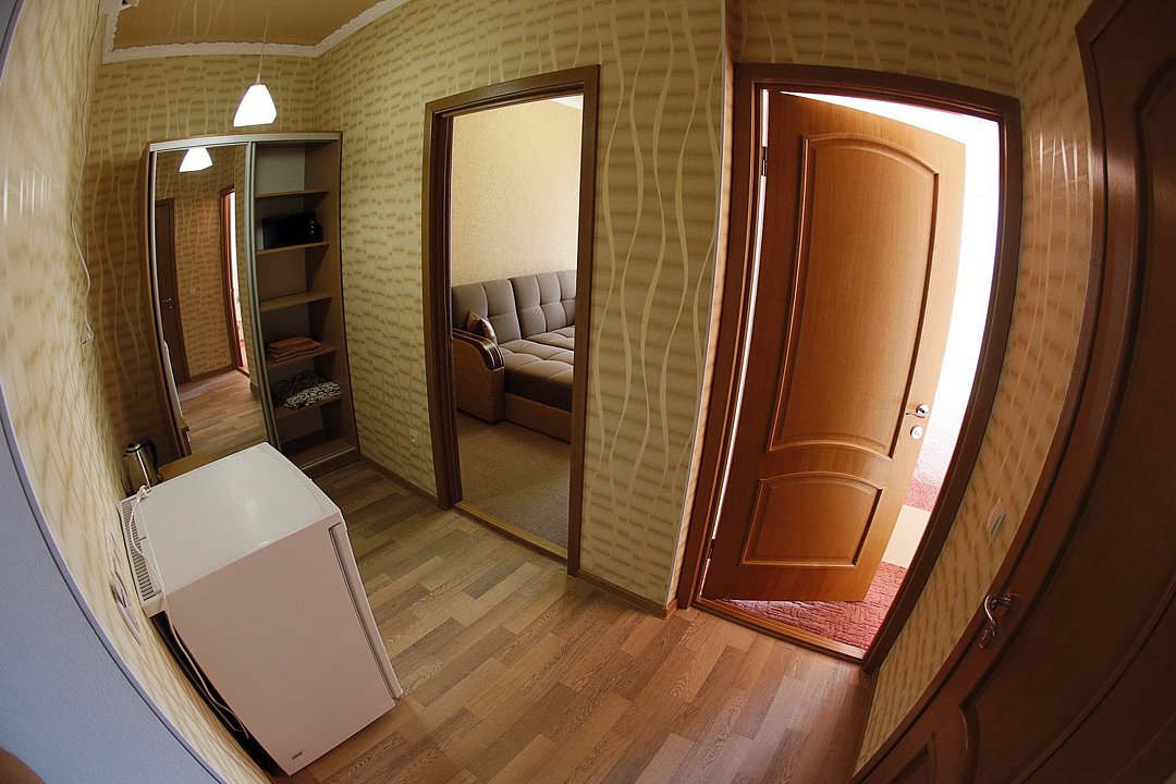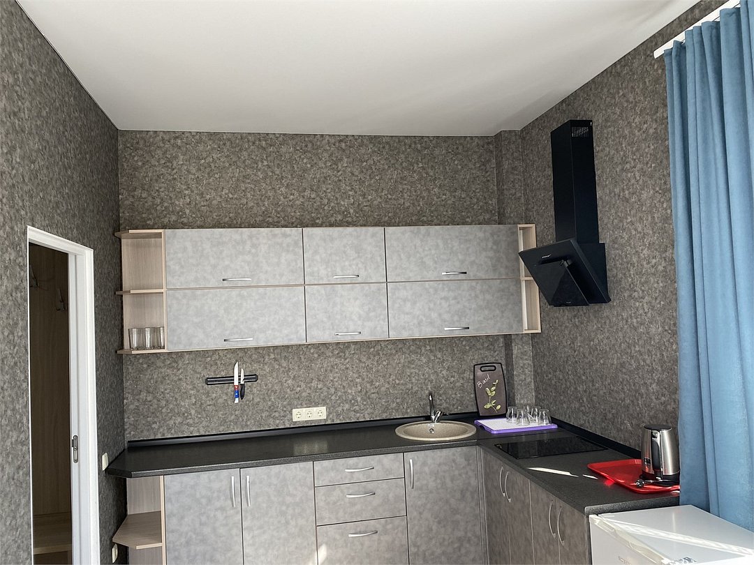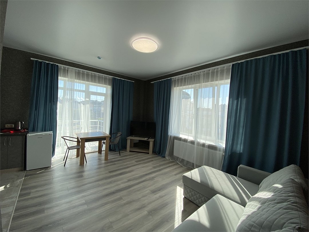 Элегантно оформленные номера люкс с c кухней. Площадь номера 45 кв.м. Вид из окна на озеро. В номере телевизор с плоским экраном, кондиционер, два балкона. Номер разделен декоративной перегородкой на зону отдыха и зону сна. В зоне отдыха встроенный кухонный гарнитур с индукционной плитой, холодильником и необходимой посудой для приготовления пищи. По заявки можно поставить кровать для новорожденного.Услуги и удобства