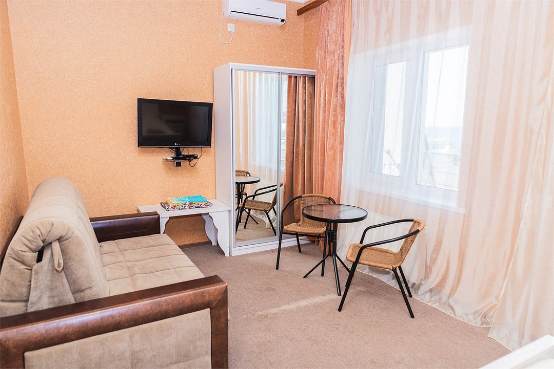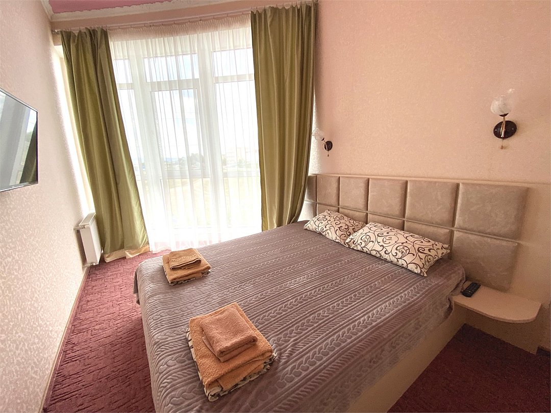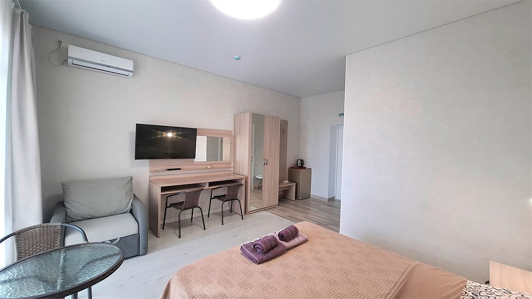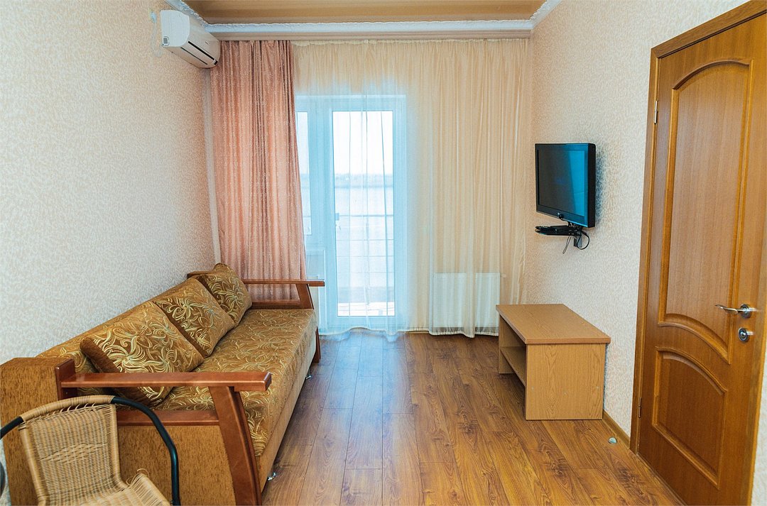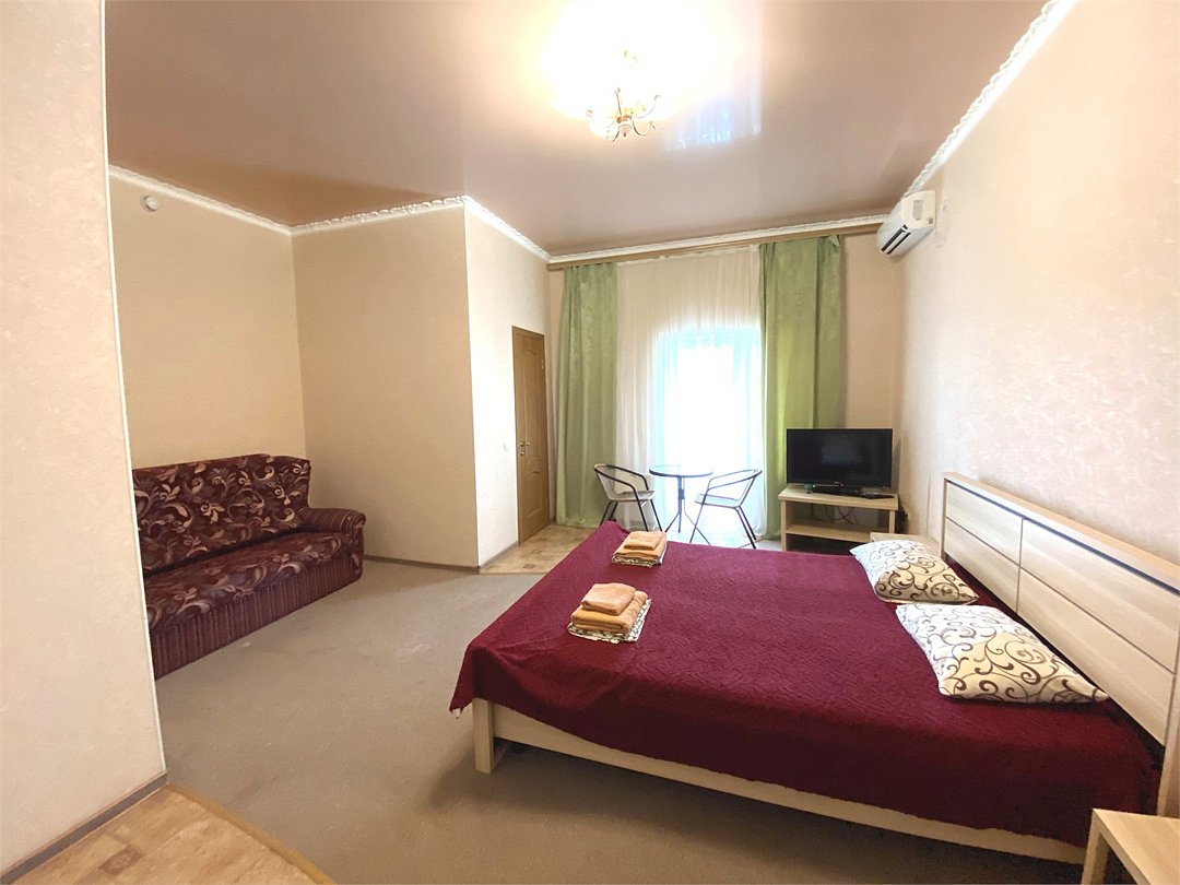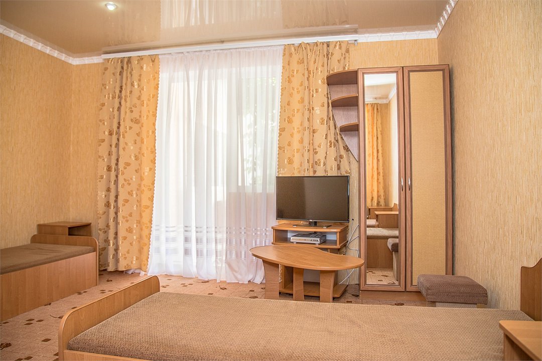 Номер Двухкомнатный Стандарт - это уютный номер, оснащенный всем необходимым для комфортного проживания 2-3-4-5 гостей или семьи из 4 -5 человек. Оснащение номера: Две односпальные кровати, двуспальный диван, односпальное кресло, Кондиционер, Телевизор, Мини-холодильник, Шкаф для одежды, Фен, Электрочайник, Постельные, банные и пляжные принадлежности.Услуги и удобства