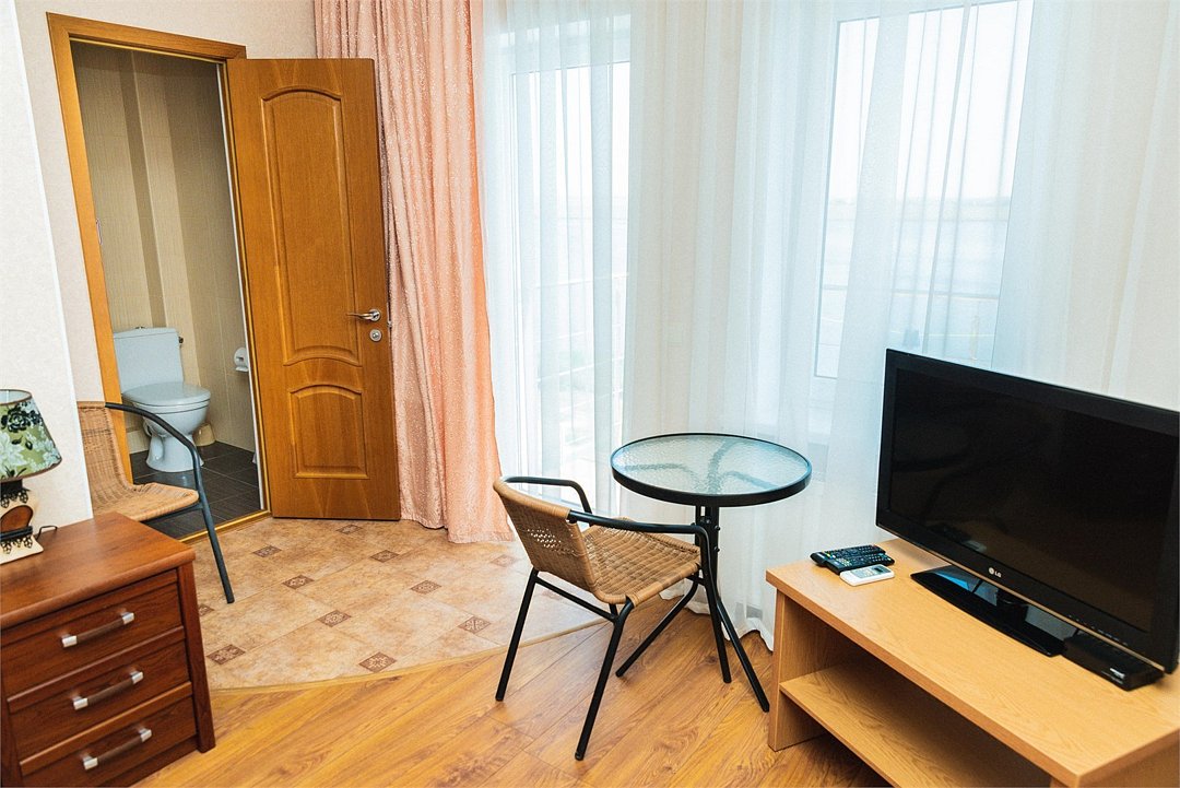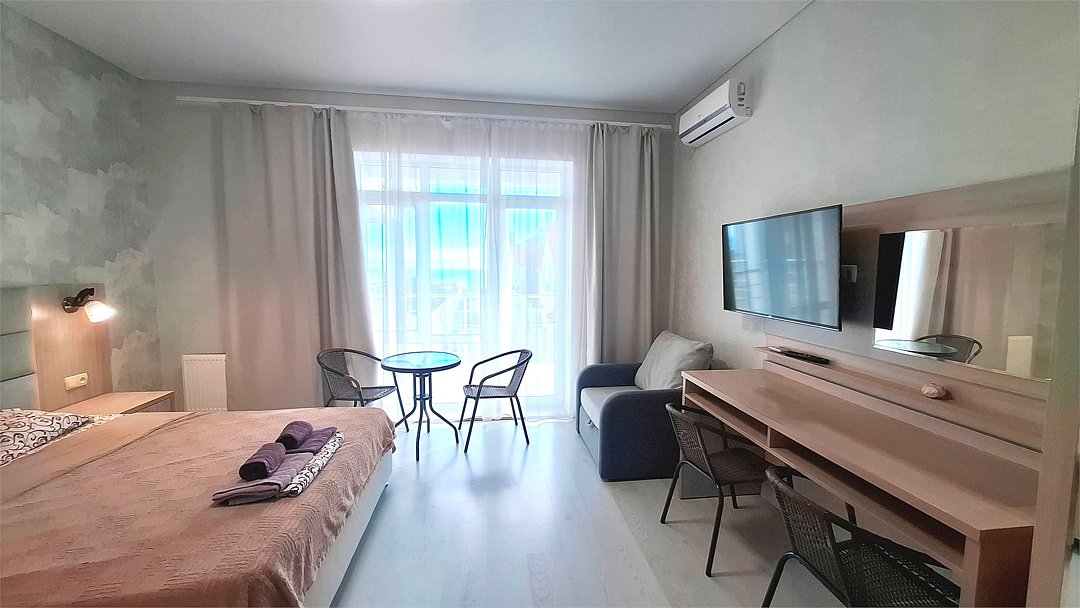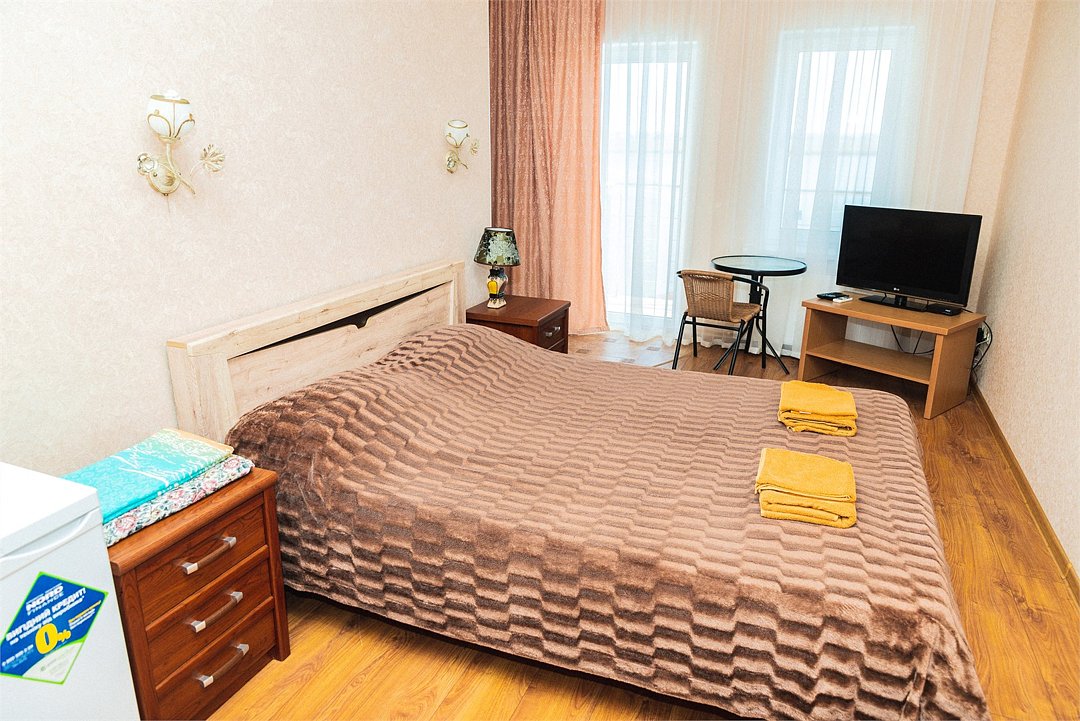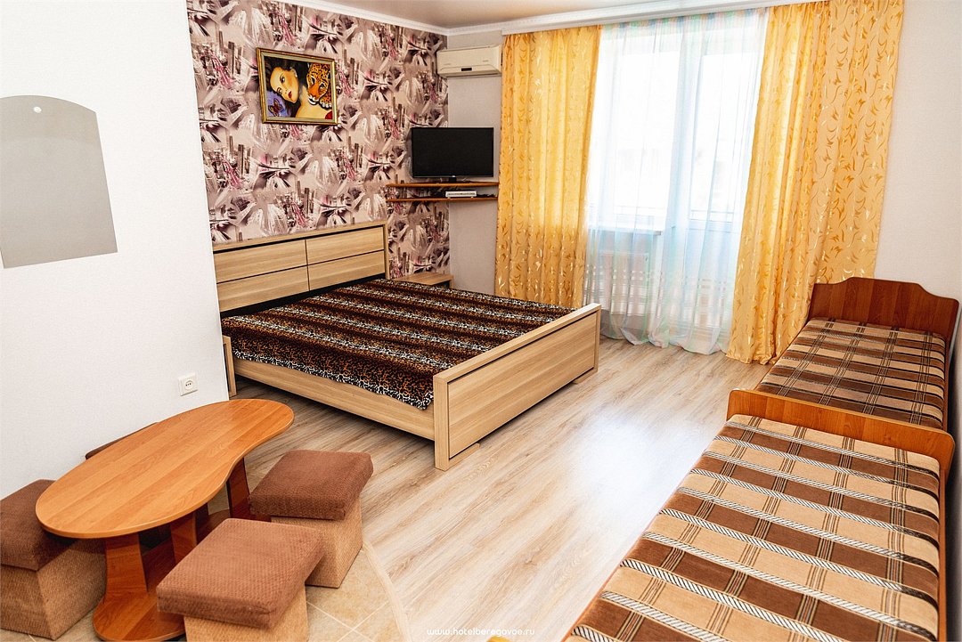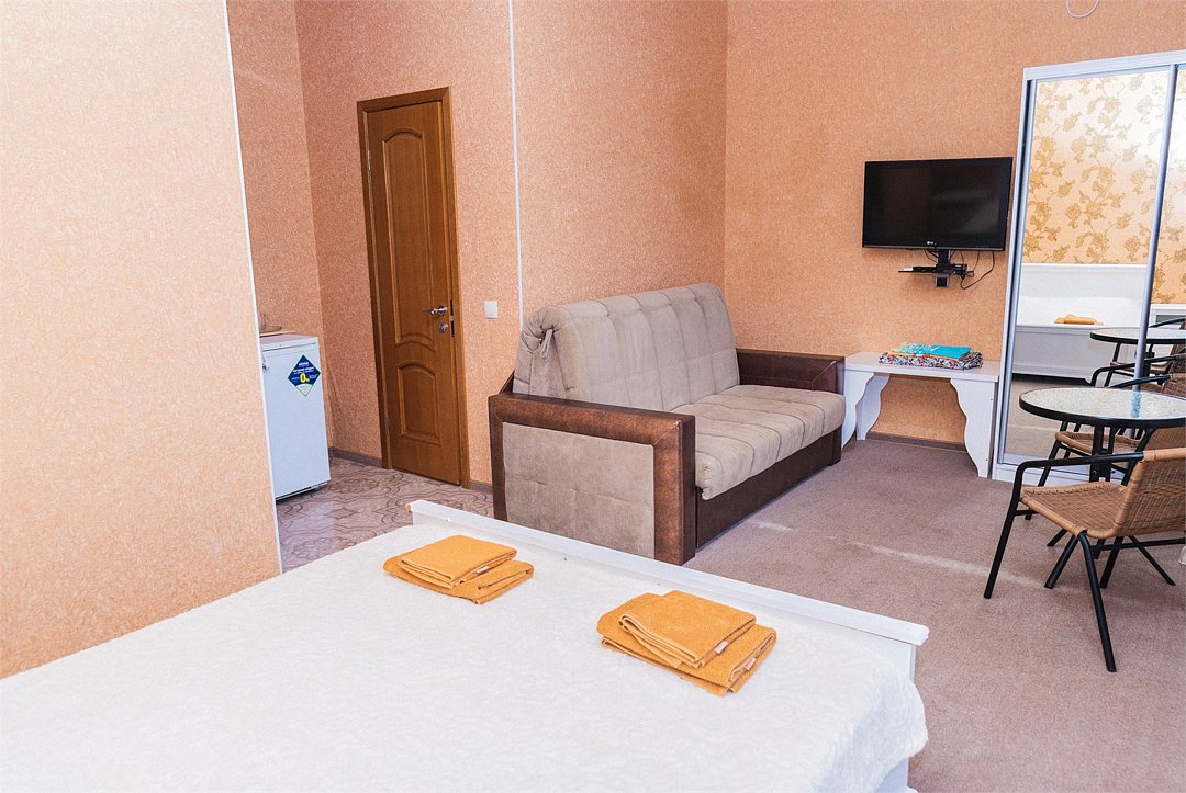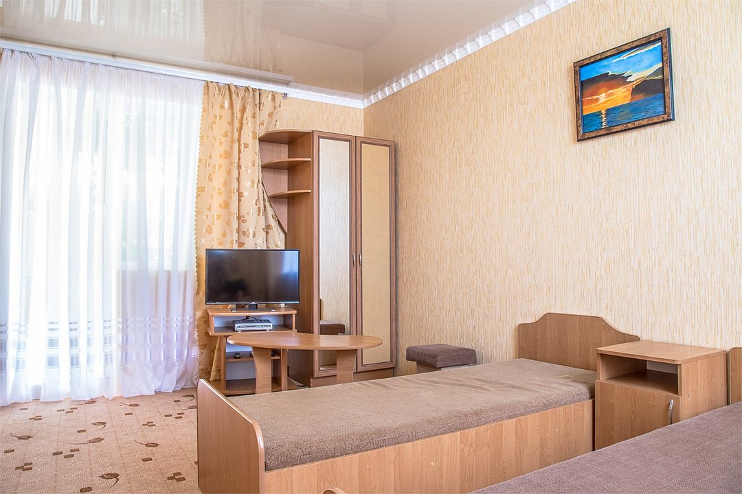 Номер Двухкомнатный Стандарт - это уютный номер, оснащенный всем необходимым для комфортного проживания 2-3-4-5 гостей или семьи из 4 -5 человек. Оснащение номера: Две односпальные кровати, двуспальный диван, односпальное кресло, Кондиционер, Телевизор, Мини-холодильник, Шкаф для одежды, Фен, Электрочайник, Постельные, банные и пляжные принадлежности.Услуги и удобства